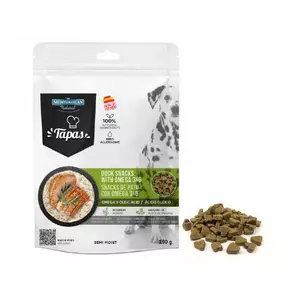 TAPAS GOURMET снеки для собак 100g, УТКА TAPAS GOURMET - это 100% натуральные лакомства для собак, изготовленные из мяса и рыбы высокого качества. Содержат масло орегано и розмарин, природные антиоксиданты, которые улучшают пищеварение. Гипоаллергенны, не содержат глютена, искусственных красителей, ГМО, трансжирных кислот. Состав 74% мяса (34% мяса утки, 25% хамона, 15% говядины), рис, растительный глицерин, пивные дрожжи. Консерванты: лимонная кислота, муравьиная кислота. Пищевые добавки: 0,08% масла орегано, 0,07% розмарина. Аналитические составляющие: Белок: 27,8%, сырой жир: 7,6%, сырая зола: 13,6%, клетчатка: 1,2%, влага: 14,8%, Кальций: 3,4г / 100г, фосфор: 1,7г / 100г, магний: 0,17 г / 100г, Омега3: 0,12 г / 100г, Омега6: 0,53г / 100г; Омега9: 1,7 г / 100 г.