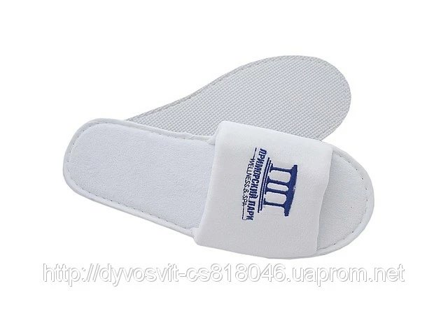 Тапочки велюровые с логотипом. Логотип нанесен вышивкой. Открытый носок.