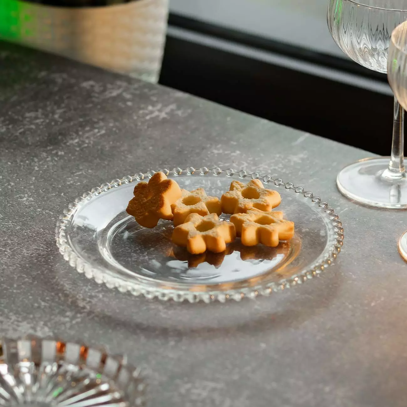 Завдяки прозорому матеріалу тарілка легко поєднується з різними стилями сервірування. Низький профіль забезпечує компактність та зручність у використанні. Підходить як для щоденного використання, так і для святкового столу.