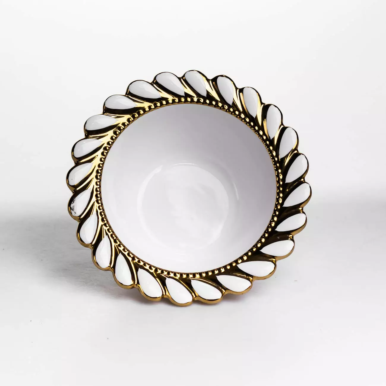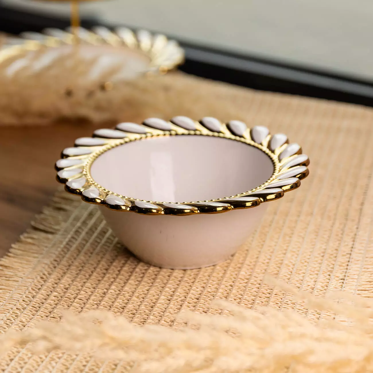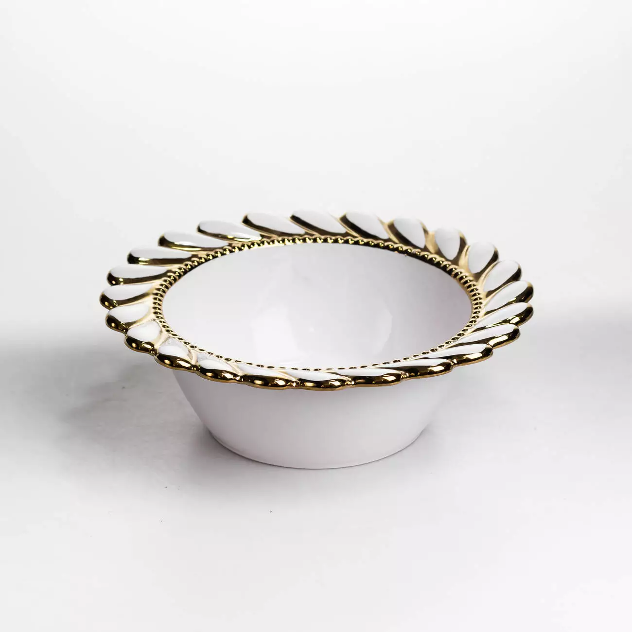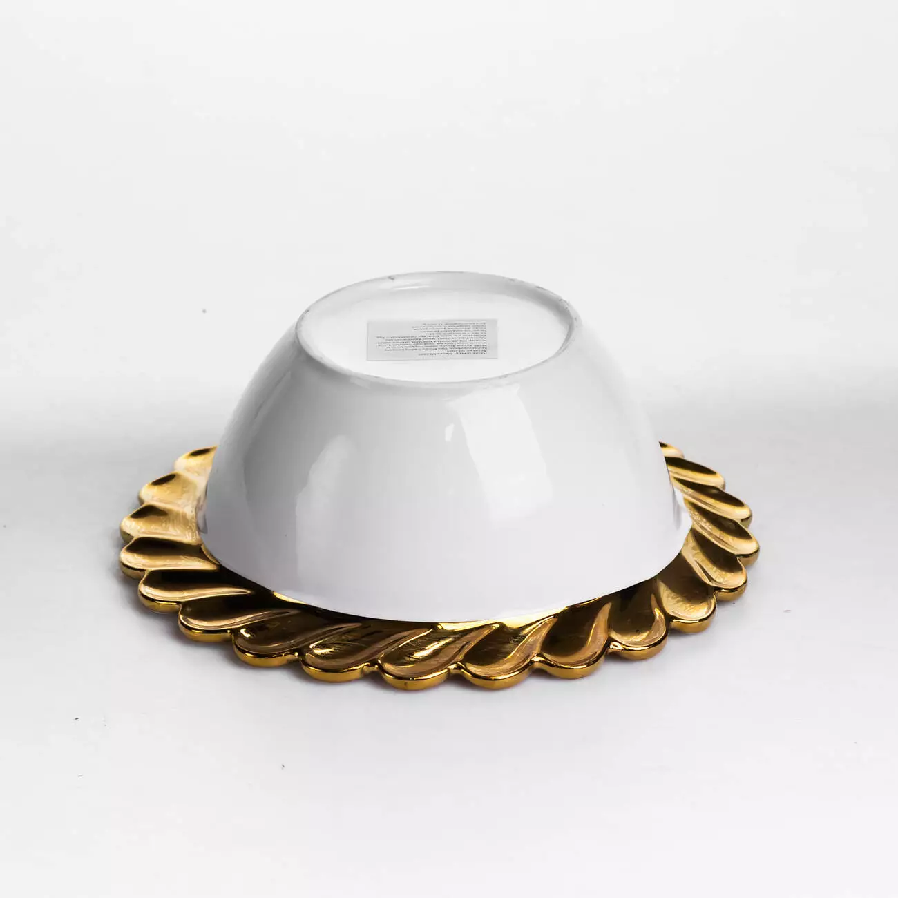 Край виробу оздоблений виразним ажурним візерунком із прорізними елементами по колу. Рельєфний декор поєднує хвилясті форми з акуратною золотою окантовкою, яка проходить як по зовнішньому краю, так і по внутрішньому обідку. Такий дизайн створює чіткий акцент на формі тарілки та додає їй помітності в сервіруванні без надмірної декоративності.