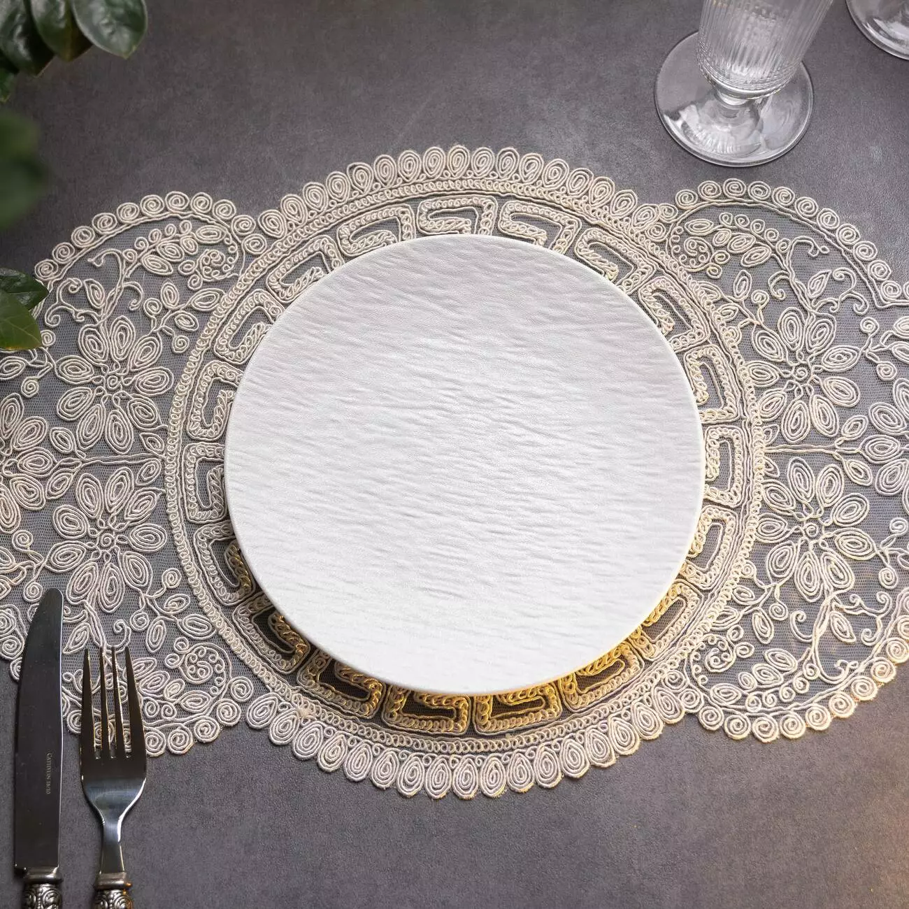 Особливість тарілки полягає в текстурному тисненні, яке нагадує природний камінь. Це оригінальне оформлення робить тарілку вишуканим вибором для сучасного інтер'єру або для сервірування столу в мінімалістичному стилі. Кам’яний орнамент додає елегантності та підкреслюючи натуральну красу посуду.