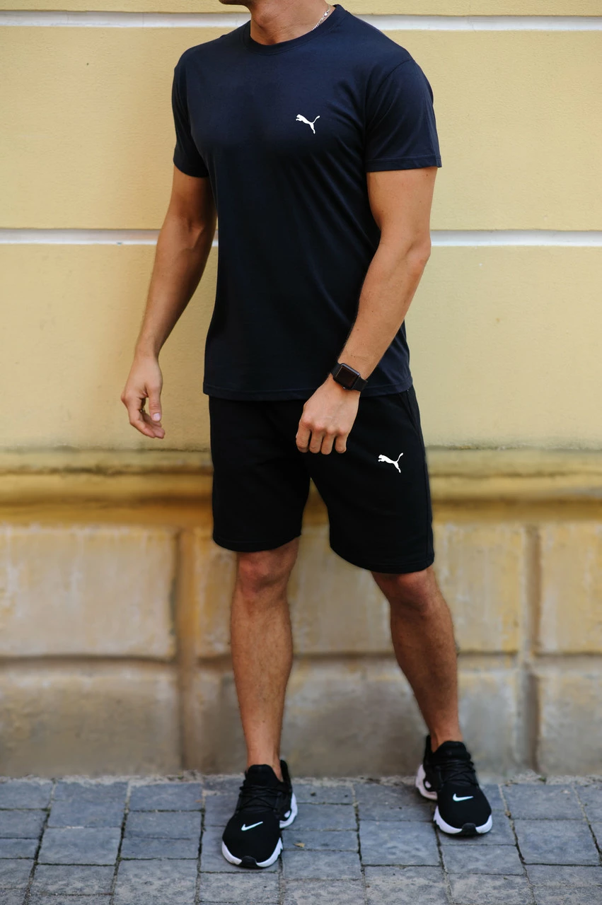 Темно-синяя футболка и черные шорты с брендами (Nike, Adidas, Reebok, Under Armour, Jordan, Fila, Puma)