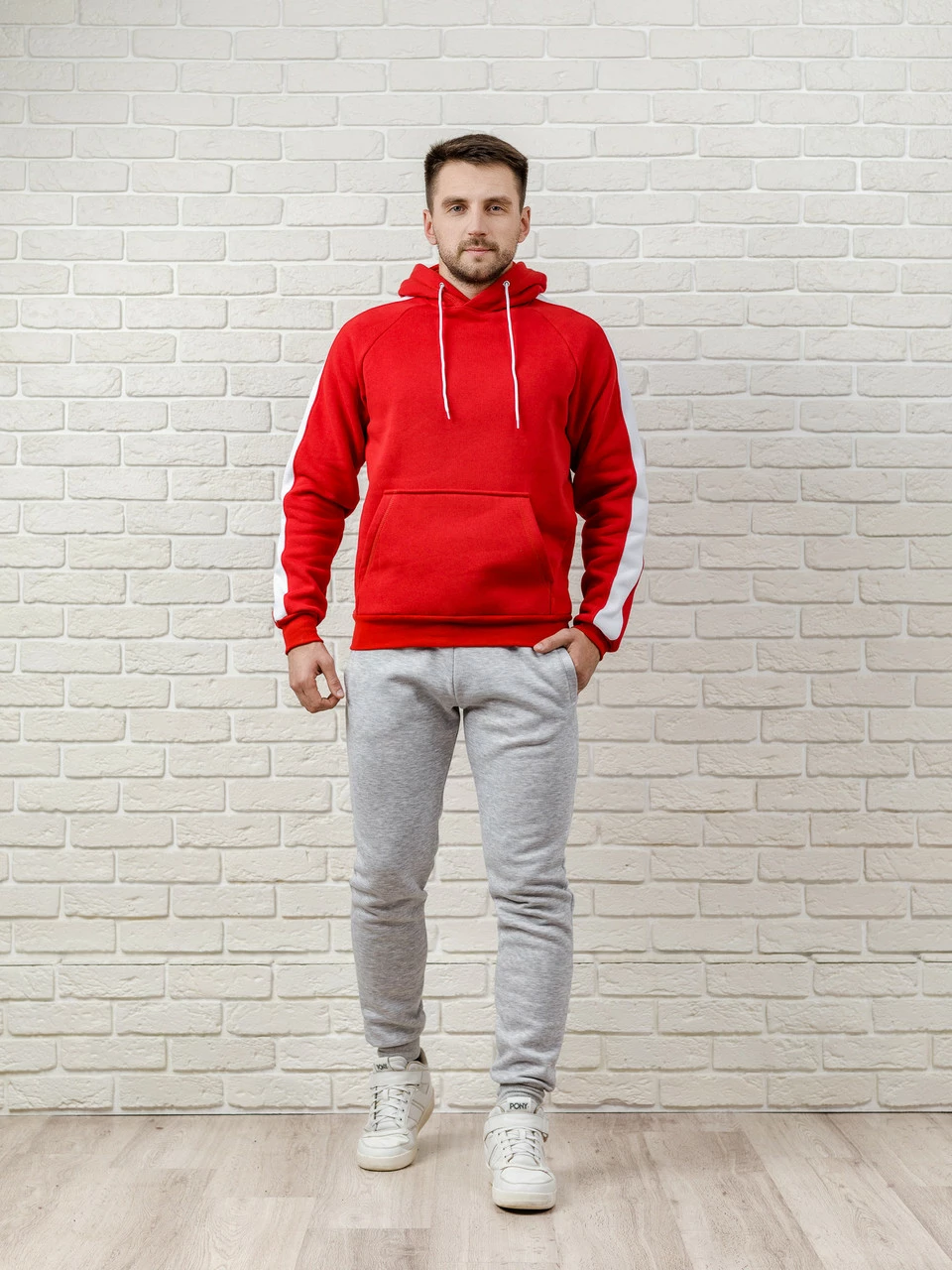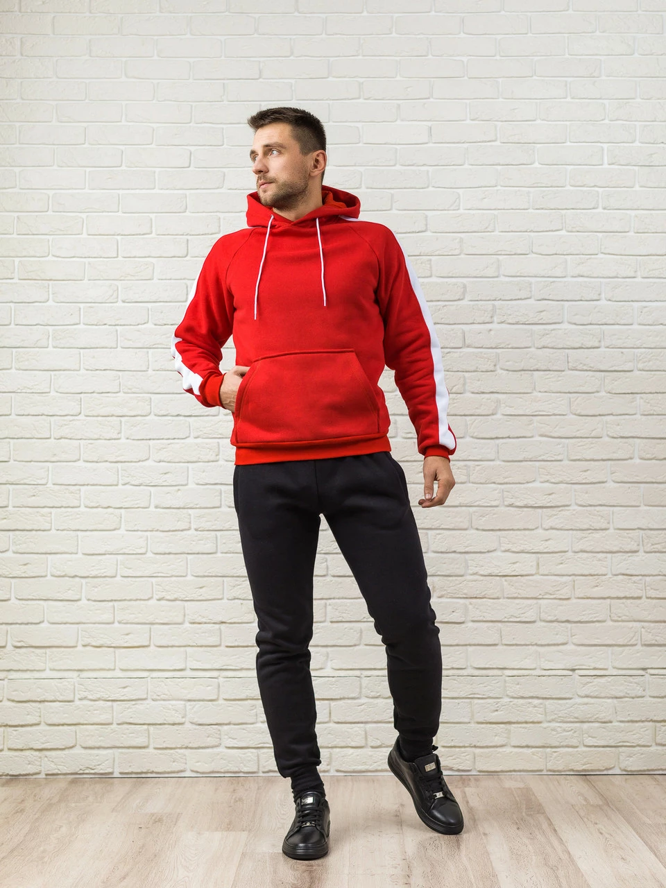 Теплый мужской спортивный костюм, красная худи с лампасами и теплые спортивные штаны (цвет на выбор)