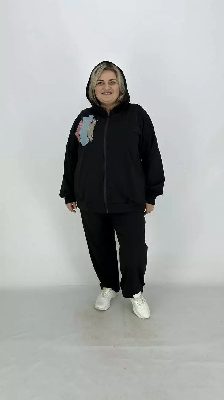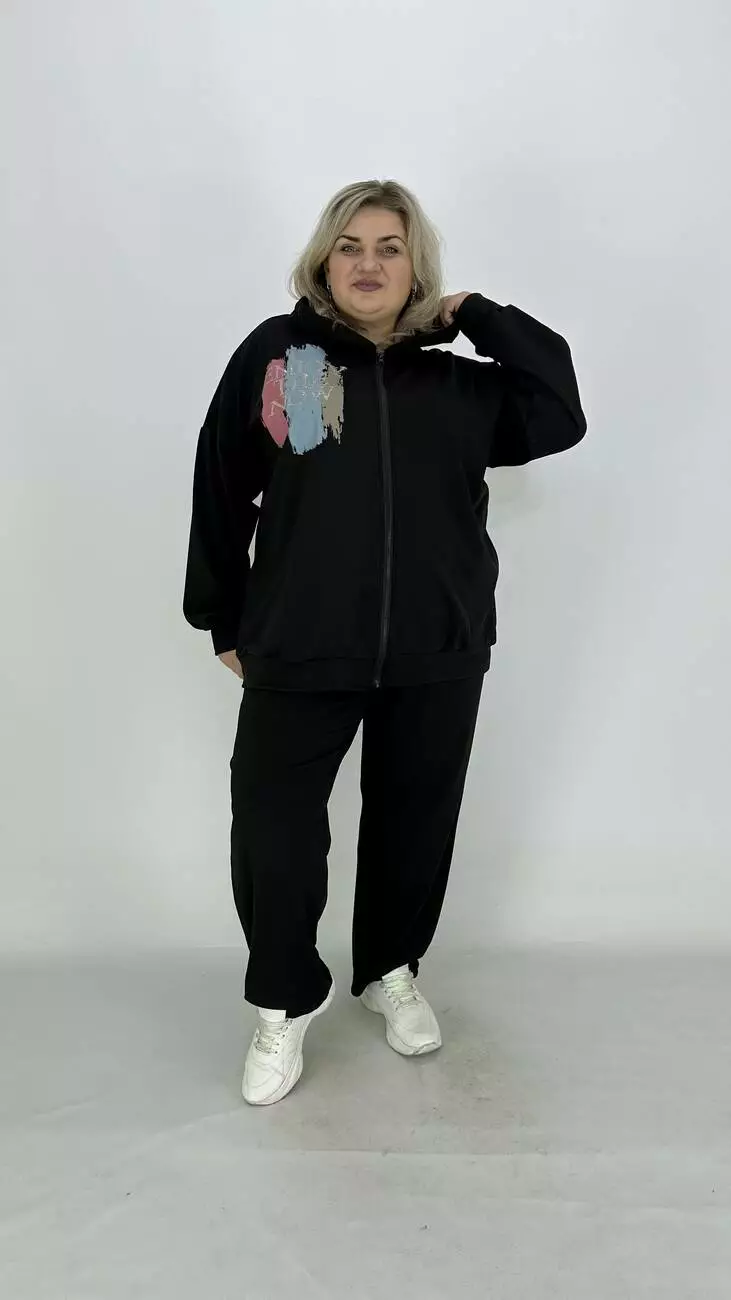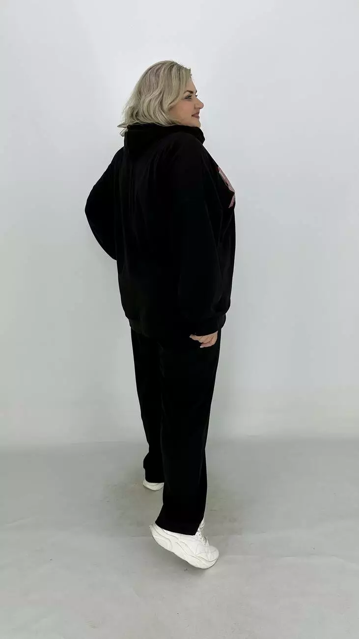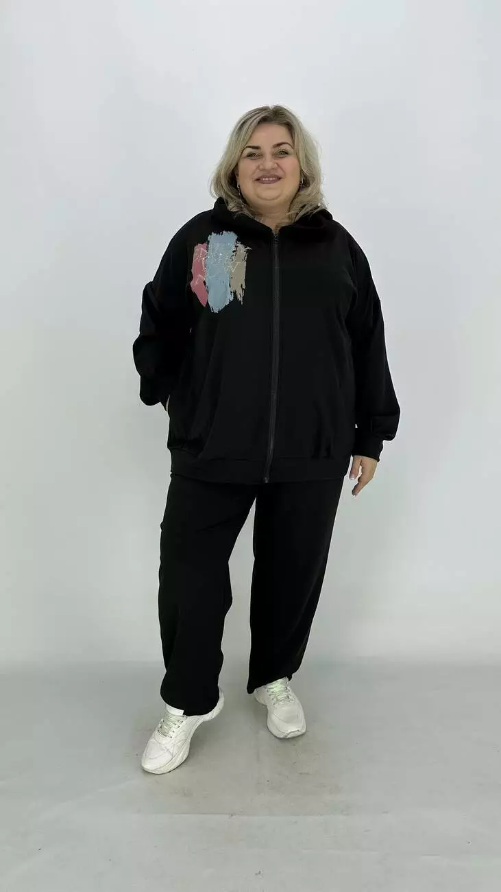 Спортивний костюм з еластичного трикотажу дайвінг, з начосом. Тканина дуже добре тягнеться, м'яка та приємна до тіла, тепла, не кашлатиться, не потребує особливого догляду. Кофта - подовжена з поясом, закриває стегна, внутрішні кишені від бокового шва. Оздоблена якісним накатом, фарба + каміння. Штани з високою посадкою, пояс на резинці, з кишенями дуже зручні.
