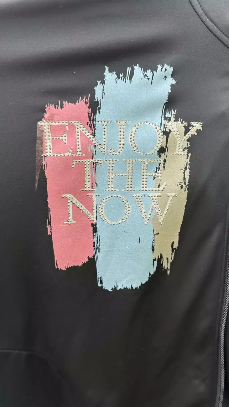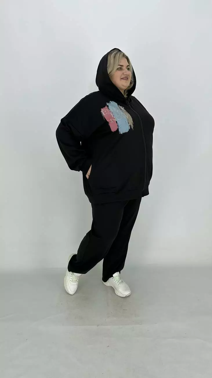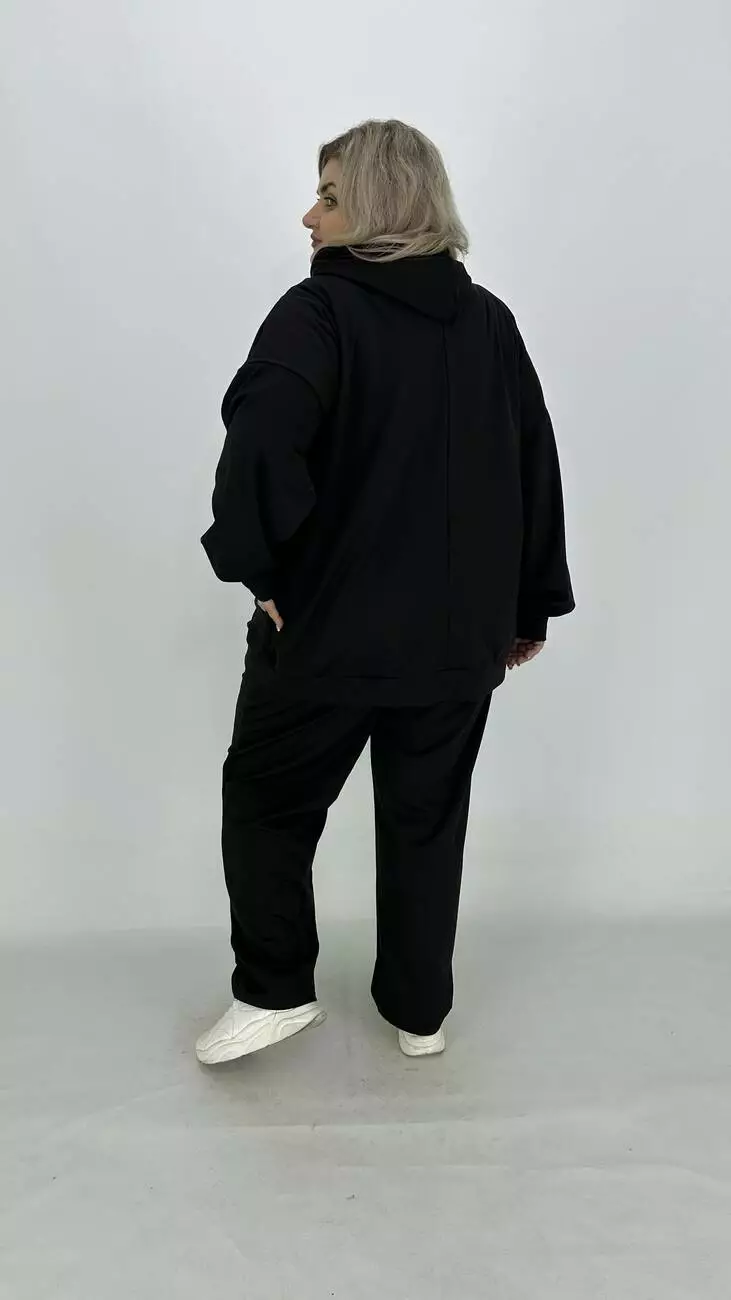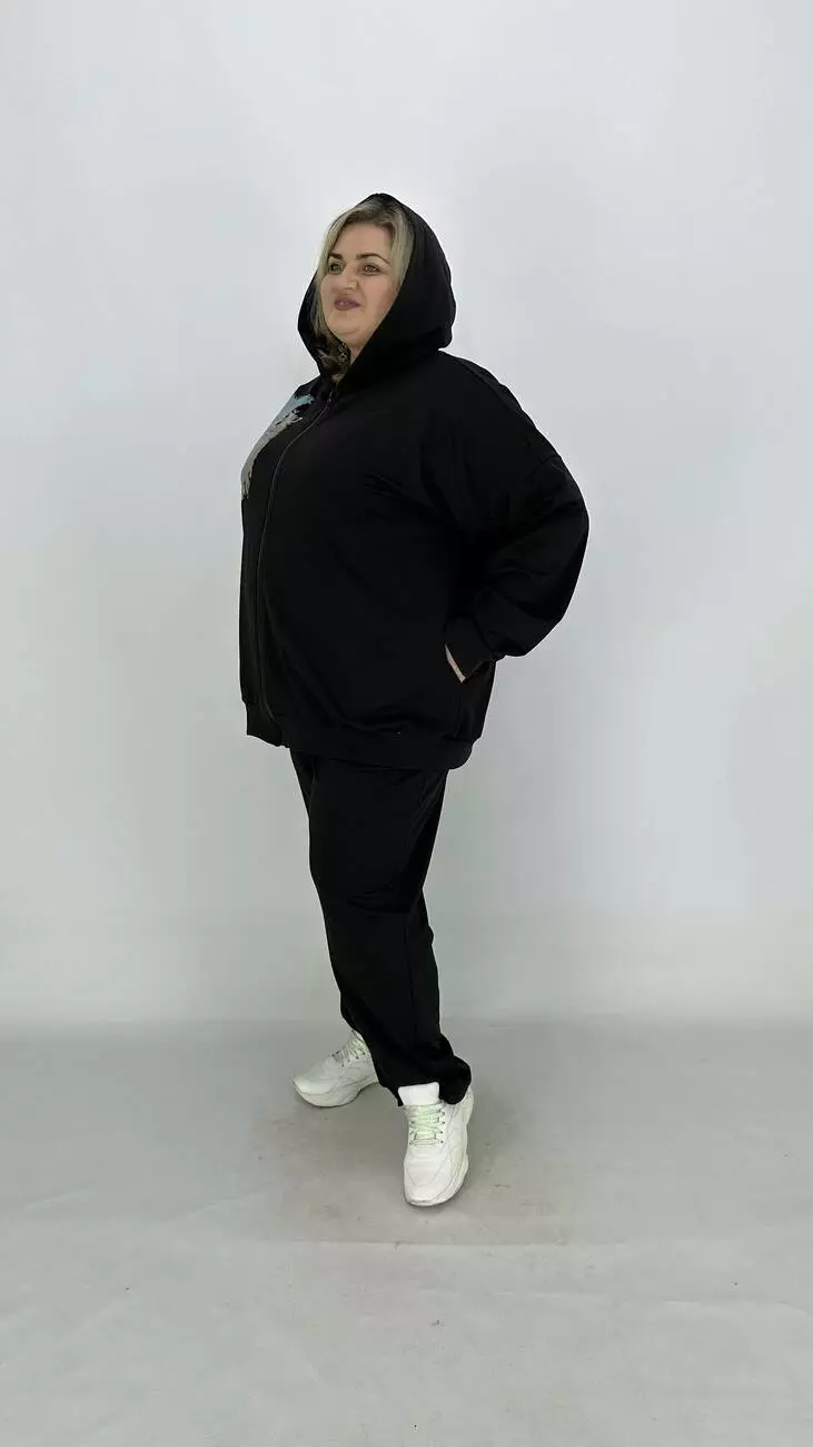 Спортивний костюм з еластичного трикотажу дайвінг, з начосом. Тканина дуже добре тягнеться, м'яка та приємна до тіла, тепла, не кашлатиться, не потребує особливого догляду. Кофта - подовжена з поясом, закриває стегна, внутрішні кишені від бокового шва. Оздоблена якісним накатом, фарба + каміння. Штани з високою посадкою, пояс на резинці, з кишенями дуже зручні.