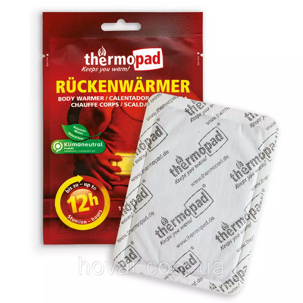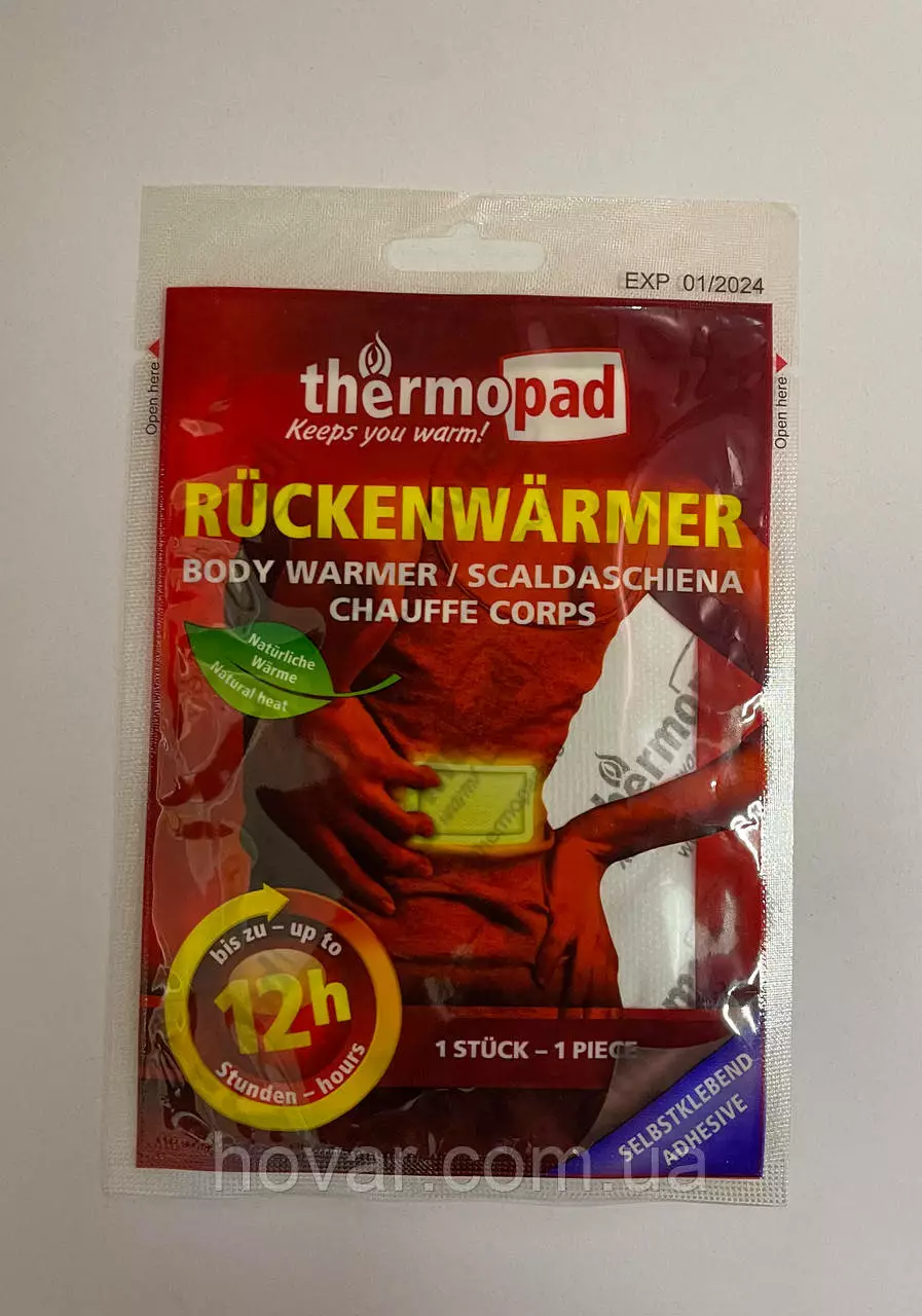 Термічна подушка, що активується повітрям, автоматично нагрівається після контакту з киснем і забезпечує природне тепло до 12 годин. Грілка постачається зі спеціальним текстильним кріпленням і може бути наклеєна на одяг на будь-якій частині тіла.