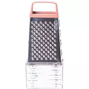 Корпус виготовлений із нержавіючої сталі, що не окислюється і не вбирає запахи, а ручка — з міцного пластику для безпечного тримання. Контейнер об'ємом 250 мл щільно кріпиться до основи тертки і дозволяє одразу збирати натерті продукти без зайвого безладу. Загальна висота тертки — 21 см, що робить її зручною у використанні на кухонній поверхні.