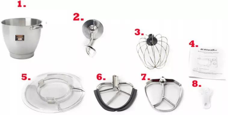 - Широкая комплектация: мощный крюк, миксер, взбивалка