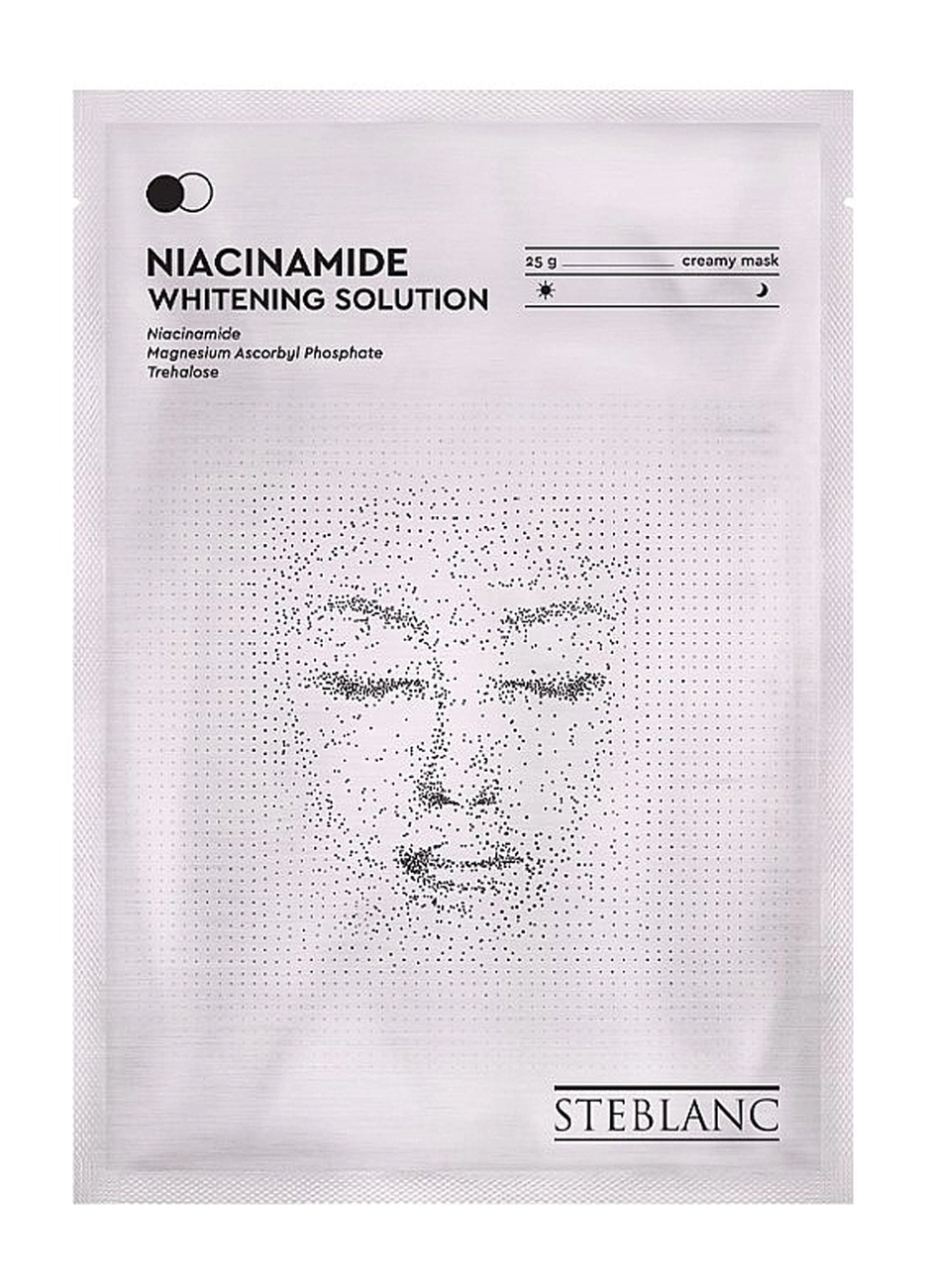 Тканевая маска для лица омолаживающая с ниацинамидом Niacinamide Whitening Solution южнокорейской компании Steblanc подходит всем, особенно рекомендована для кожи с признаками возрастных изменений, сухой и чувствительной. Мягкий нетканый материал плотно прилегает к поверхности кожного покрова, обеспечивает глубокое проникновение кремовой эссенции в слои кожи.