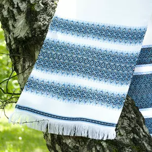 Традиційний синій вишитий рушник, часто використовується в українських обрядах.