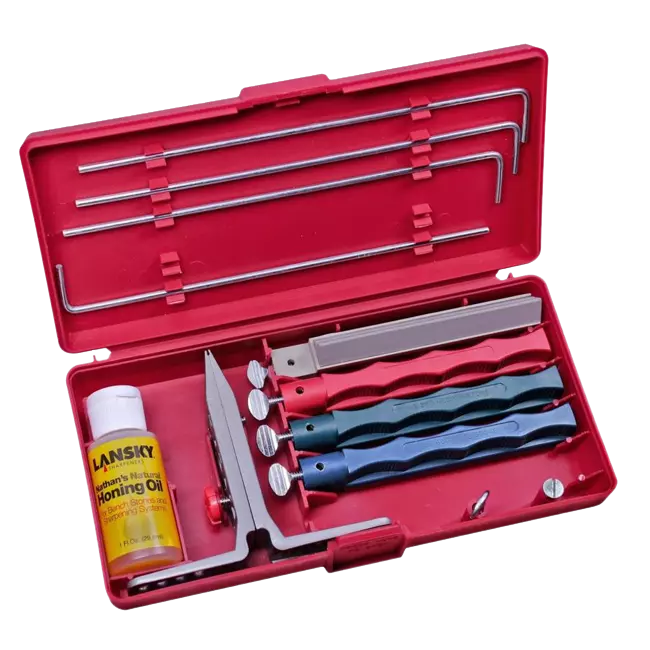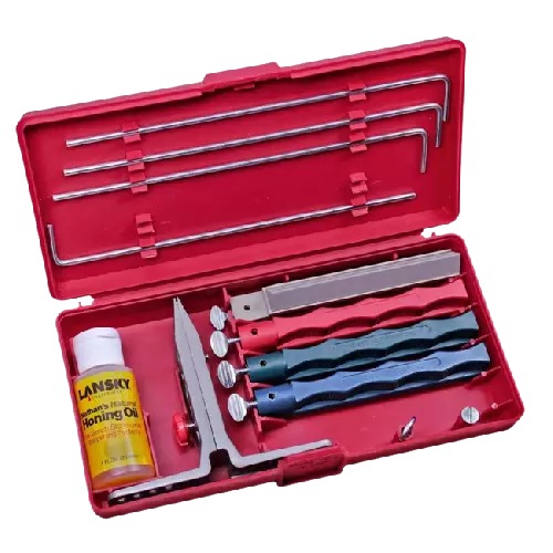 Основою набору є затиск для ножа, що дозволяє фіксувати кут, під яким проводиться заточка. Робочі інструменти заточування – точильні камені – мають рукоятки, що розрізняються за кольором залежно від ступеня зернистості). В даному наборі чотири таких каменю: середньозернистий серрейторный, крупнозернистий, середньо - і дрібнозернистий. Для кожного з точильних каменів є своя напрямна. Крім цього, в набір входить масло для точильних каменів, за допомогою якого досягаються найкращі результати і яке одночасно зменшує знос самих каменів, продовжуючи його термін служби. Набір зберігається в акуратному кейсі, де кожен предмет має своє місце.