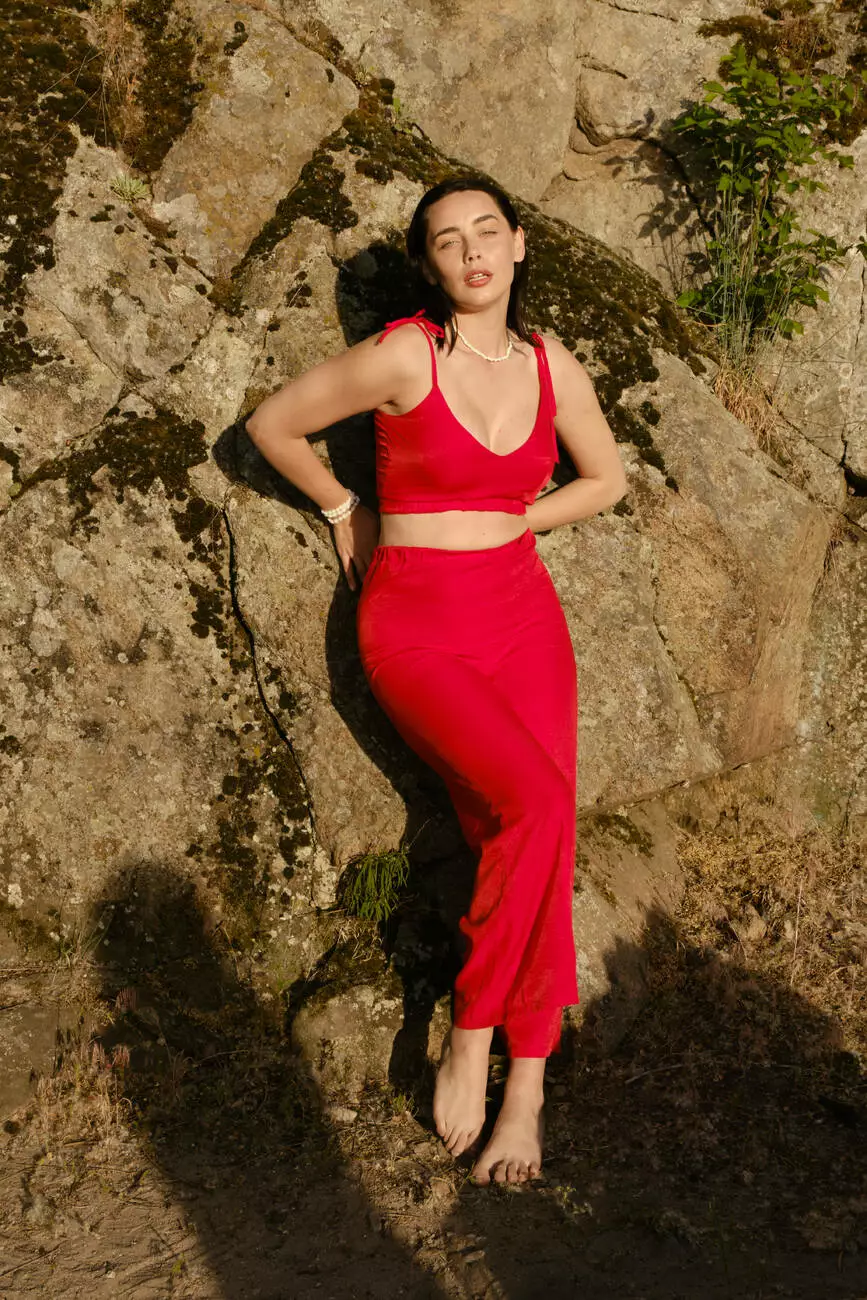 Готові представити наш червоний топ на завʼязках, ніжний та приємний на дотик, як шовк. Ми пройшли довгий шлях пошуку тканини, яка би поєднала в собі невагомість і простоту в догляді, і нарешті знайшли ідеальний матеріал.