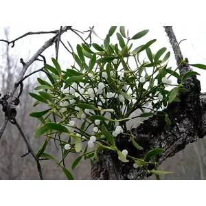 Омела – это многолетнее вечнозеленое растение-паразит, высота которого может варьироваться в пределах от 20 до 120 см. Деревянистые голые ветви легко ломаются. Корни омелы без труда проникают под древесину и кору дерева-хозяина. Бледно-зеленые листья имеют продолговатую форму с параллельным жилкованием. Листья располагаются на ветвях попарно.