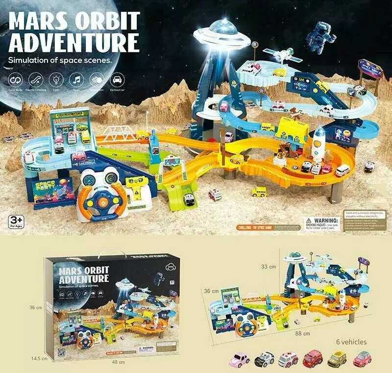 Главная > Каталог > Игрушки > Автотреки, гаражи > Трек T 918 A (8) “Космічна станція”, електричні підіймачі, світло, звуки, пісні англійською, 6 машинок, від батарейок, 2в1, в коробці оптом