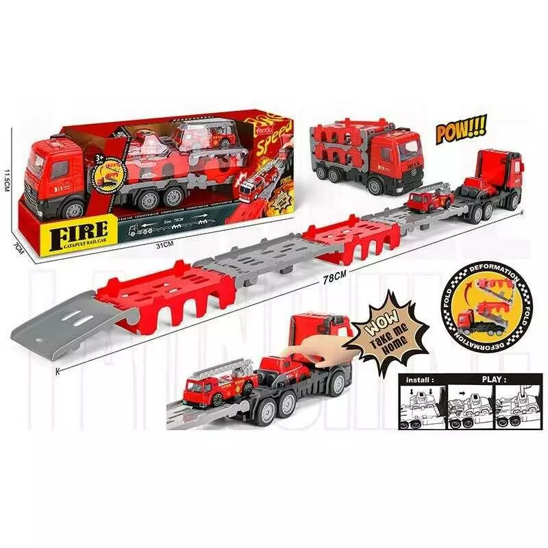 Трейлер 8901 (96/2) трек, довжина - 78 см, інерція, 1 машинка, механічний запускач, гумові шини, в коробці