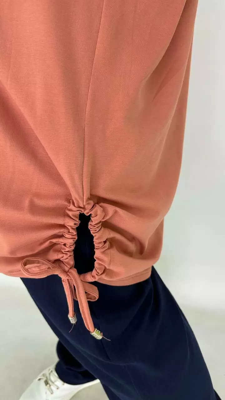 Вільний силует з асиметричним низом, з боку-стяжка, рукав на манжеті.