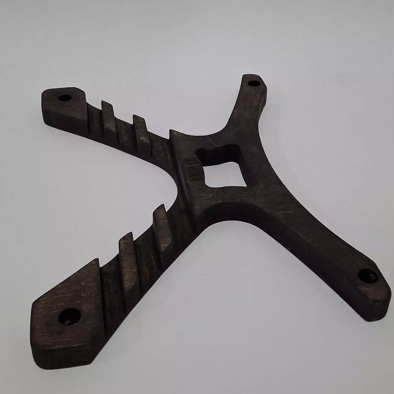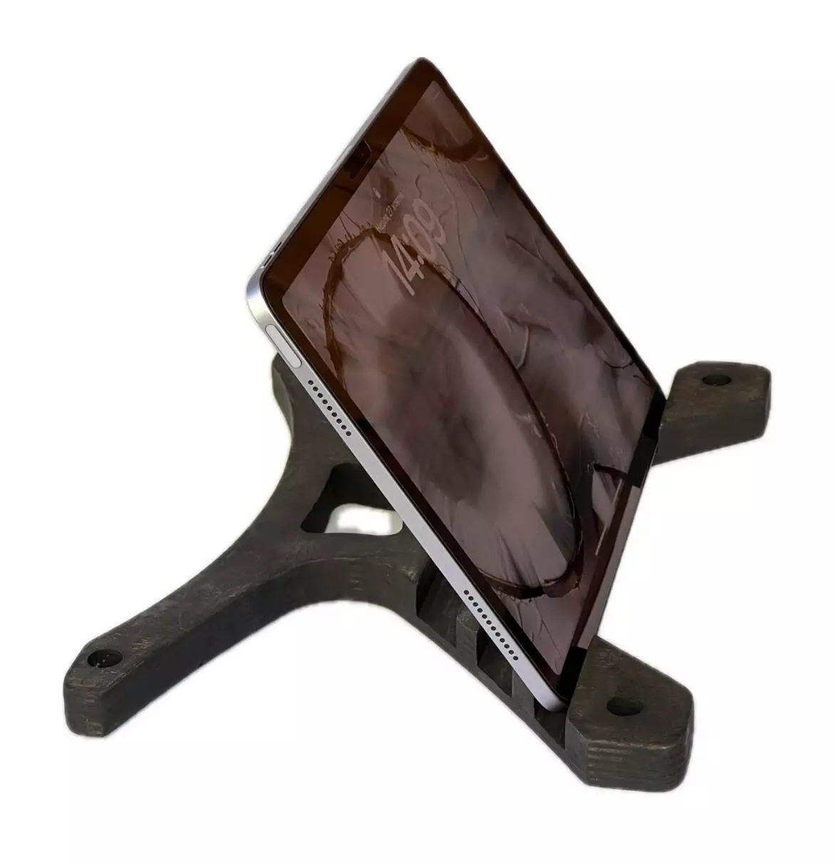 Тримач виконаний з натуральної вологостійкої фанери, товщиною 18мм. Має ергономічну форму, яка дозволить розташувати Ваш гаджет в будь-якому зручному положенні. Має декілька фіксуючих положень, дозволяє розміщувати планшет чи телефон під різним нахилом.