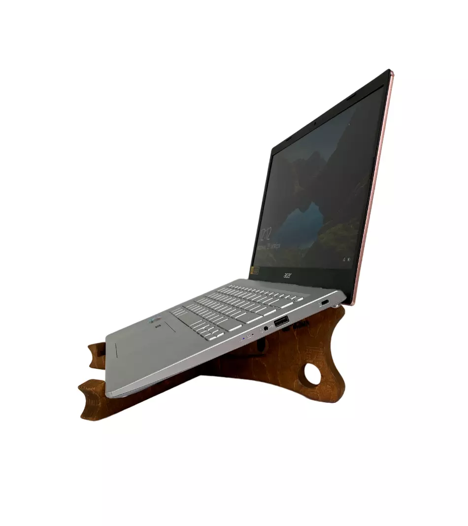 Тримач виконаний з натуральної вологостійкої фанери, товщиною 18мм. Має ергономічну форму, яка дозволить розташувати Ваш гаджет в будь-якому зручному положенні. Тримач потрібен для зручності роботи, також створює пространство між ноутбуком на поверхнею для кращого охолодження.