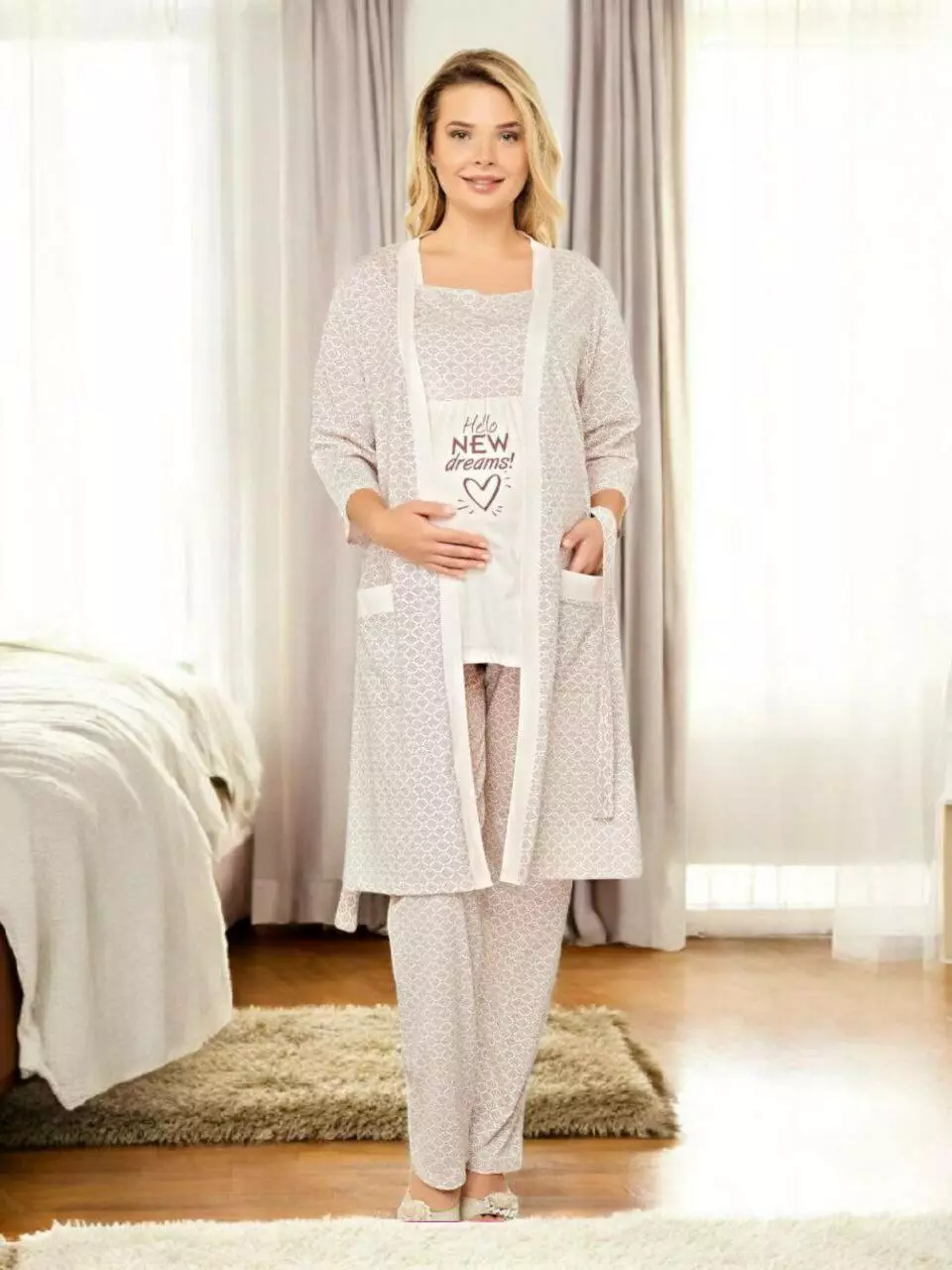 Комплект для майбутніх мам і годування- комфорт і стиль в одному комплекті. У набір входить футболка,штани та халатик на поясі. Натуральна бавовна з ніжним квітковим принтом дарує шкірі приємні відчуття та не викликає подразнень. Футболка має зручний крій для періоду вагітності й після пологів,забезпечуючи свободу рухів і простий доступ для годування. Ідеальний варіант для домашнього відпочинку,пологового будинку або подарунка майбутній мамі.