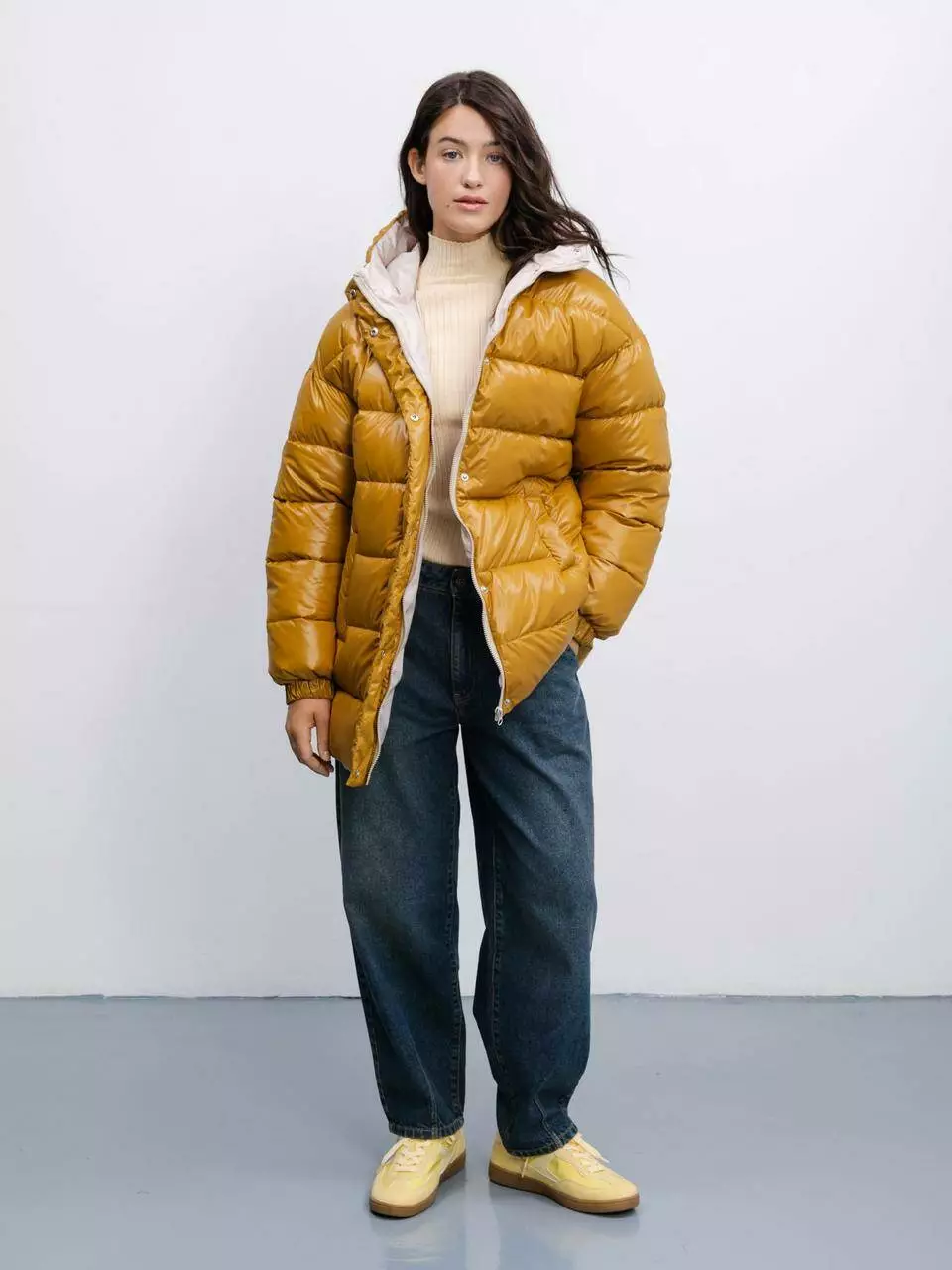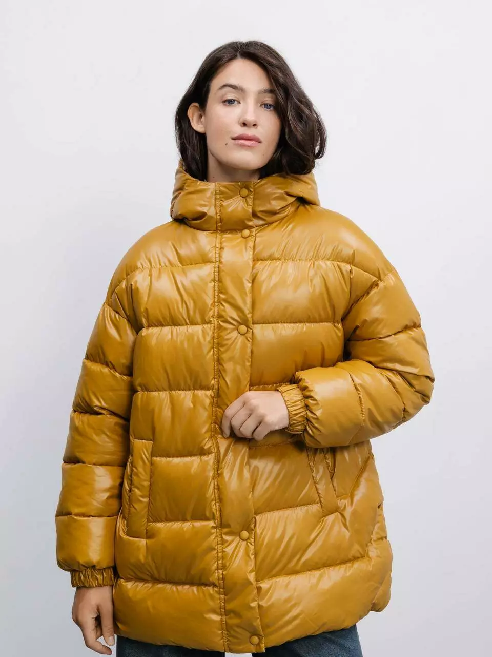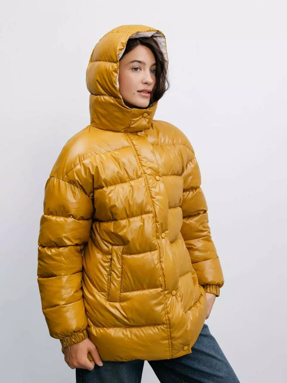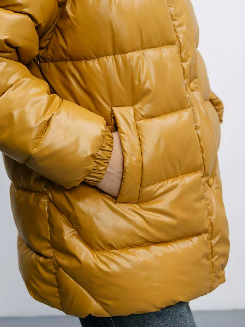 Гірчичний колір куртки додає яскравості та стилю вашому зимовому