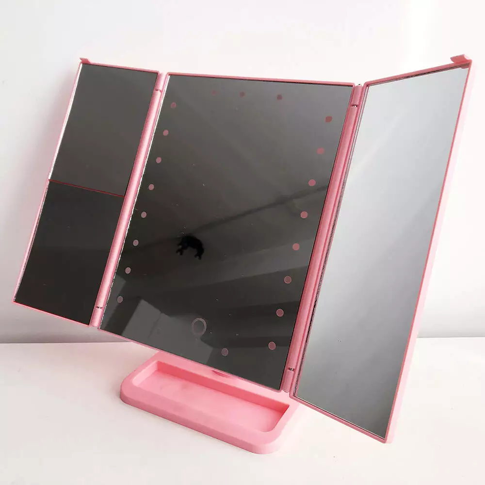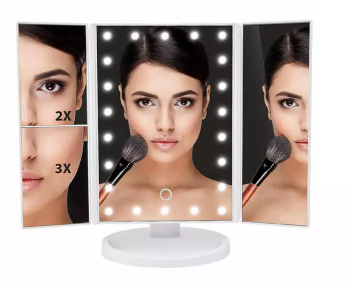 Настольное косметическое складное зеркало с LED-подсветкой для макияжей с боковыми зеркалами, сенсорным датчиком включения и увеличительными секциями.