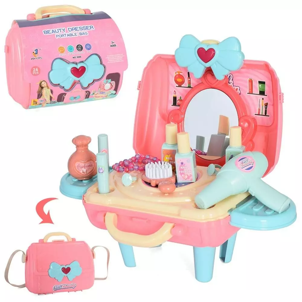 Фотография 1 товарной позиции интернет-магазина детских игрушек www.smarttoys.com.ua Трюмо 3666 фен, гребінець, флакони, 24предм., склад.в сумочку, карт.оберт., 23-18-10см.