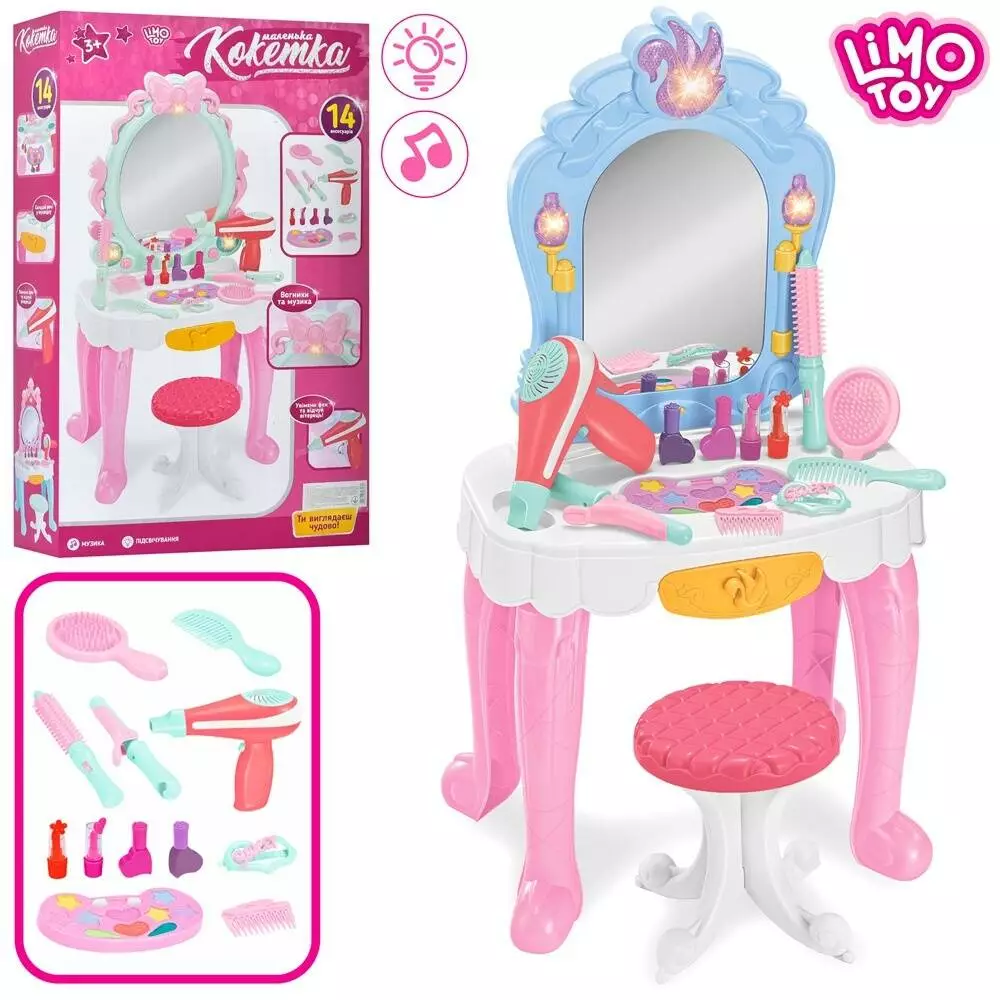 Фотография 1 товарной позиции интернет-магазина детских игрушек www.smarttoys.com.ua Трюмо 7940 стілець, гребінець, фен, флакони, муз, світло, бат., кор., 37,5-60-12см.