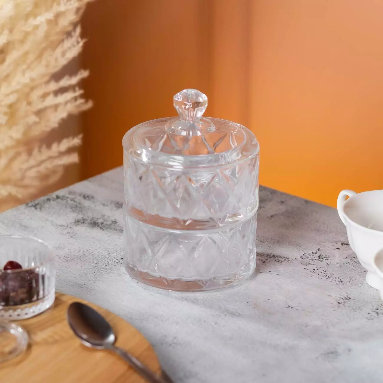 Цукерниця дворівнева зі скляною кришкою має висоту 15 см і діаметр 10 см. Виготовлена зі скла, стилізованого під кришталь, що надає їй виразного вигляду з переливами світла. Дворівнева конструкція забезпечує зручний поділ солодощів або інших дрібних продуктів.