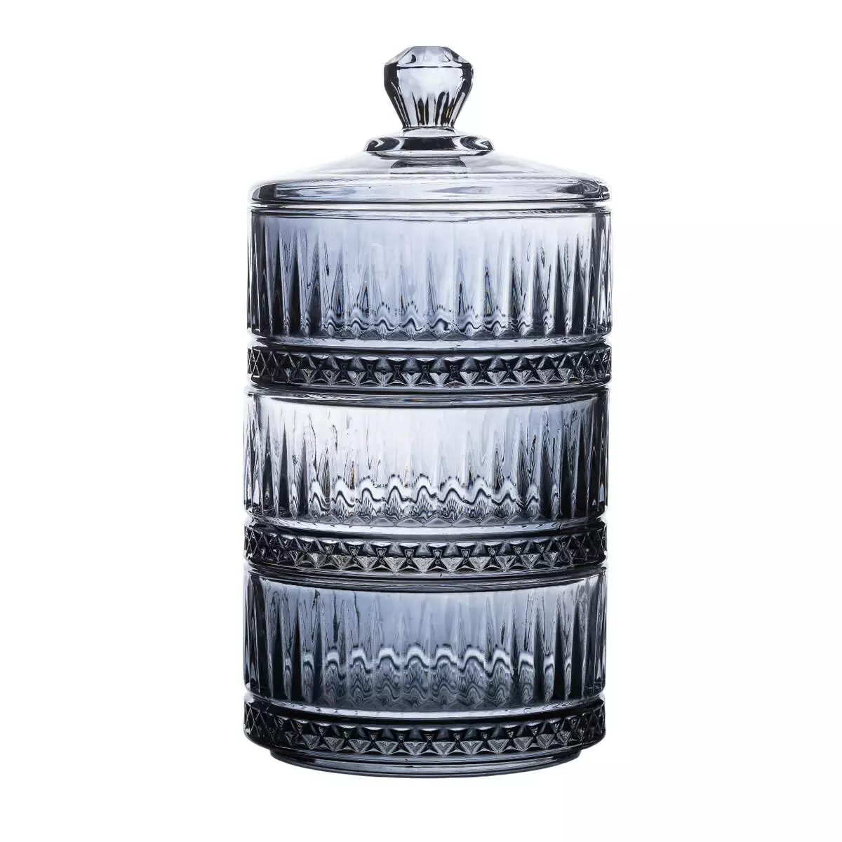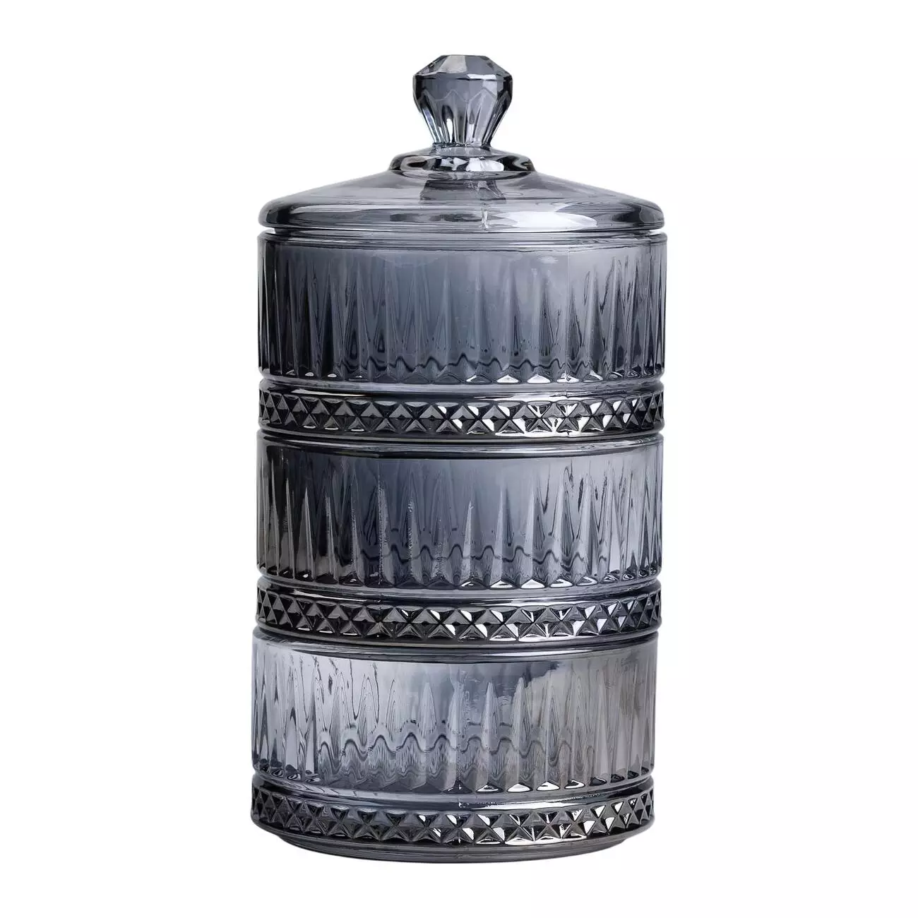 Цукерниця трирівнева скляна має висоту 20 см і діаметр 10 см. Виготовлена з прозорого скла з ребристою текстурою, що надає виробу класичного вигляду та декоративної привабливості. Конструкція включає три рівні, що дозволяє зручно розміщувати різні види цукерок, печива або інших дрібних солодощів.