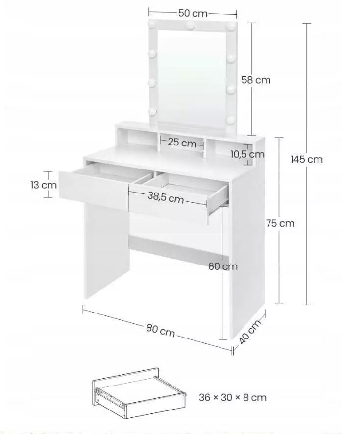 Розміри туалетного столика: 80 х 40 х 145 см (ширина х глибина х