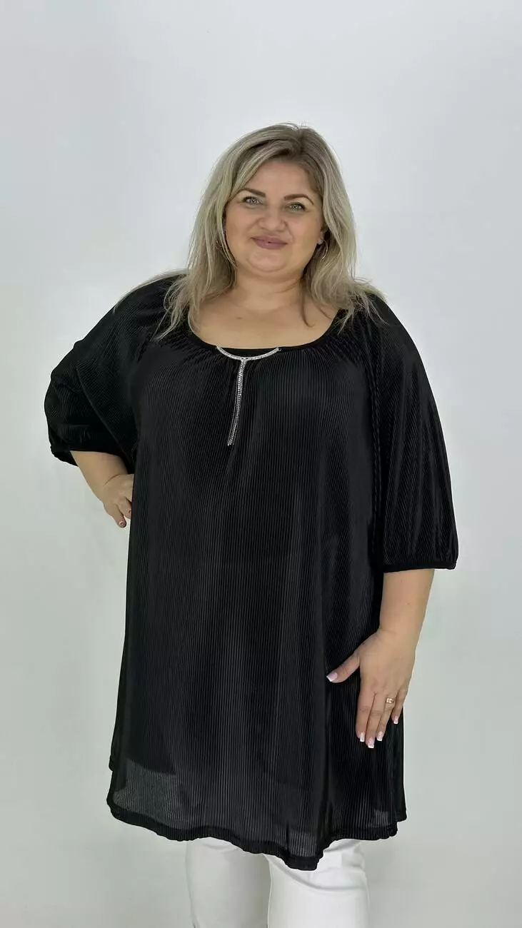 Вільна туніка із гофрованого трикотажу. Дуже хороша розтяжність, не меніться, не потребує особливого догляду. Силует трапеція, рукав реглан, горловина прилаштована та прикрашена пришевним кольє з камінням.