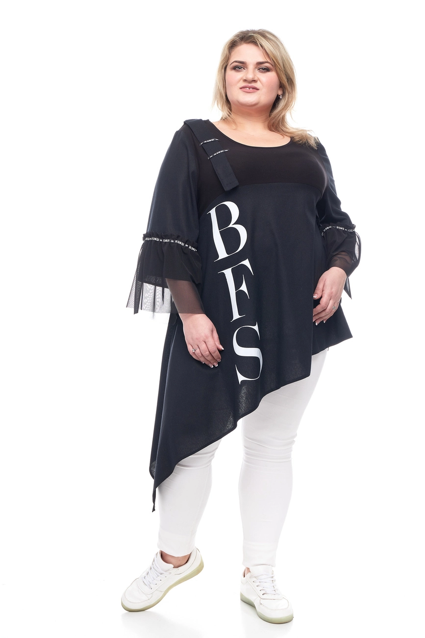 Тканина: льон -100% льон, віскоза-95% віскоза; 5% еластан. Стильна туніка напівприлеглого силуету; рукав – 3/4 доповнений сіткою; горловина кругла. Низ виробу асиметричний - подовжений з одного боку. Туніка виконана з тканини льон, поличка виконана з тканини віскоза. Виріб прикрашений накаткою літер та лямкою на одне плече.
