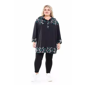 Тканина: двонитка - 47% бавовна, 50% поліестер, 3% еластан. Туніка-сорочка з трикотажу двонитка середньої щільності з гарною розтяжністю, дуже м'яка і приємна до тіла. Силует вільний А-подібний, спущене плече, рукав широкий 5/6 з манжетом. Планка декоративна не розтігується, прикрашена клейовими камінцями. Рекомендується прати вручну при температурі 30 градусів. Розміри :