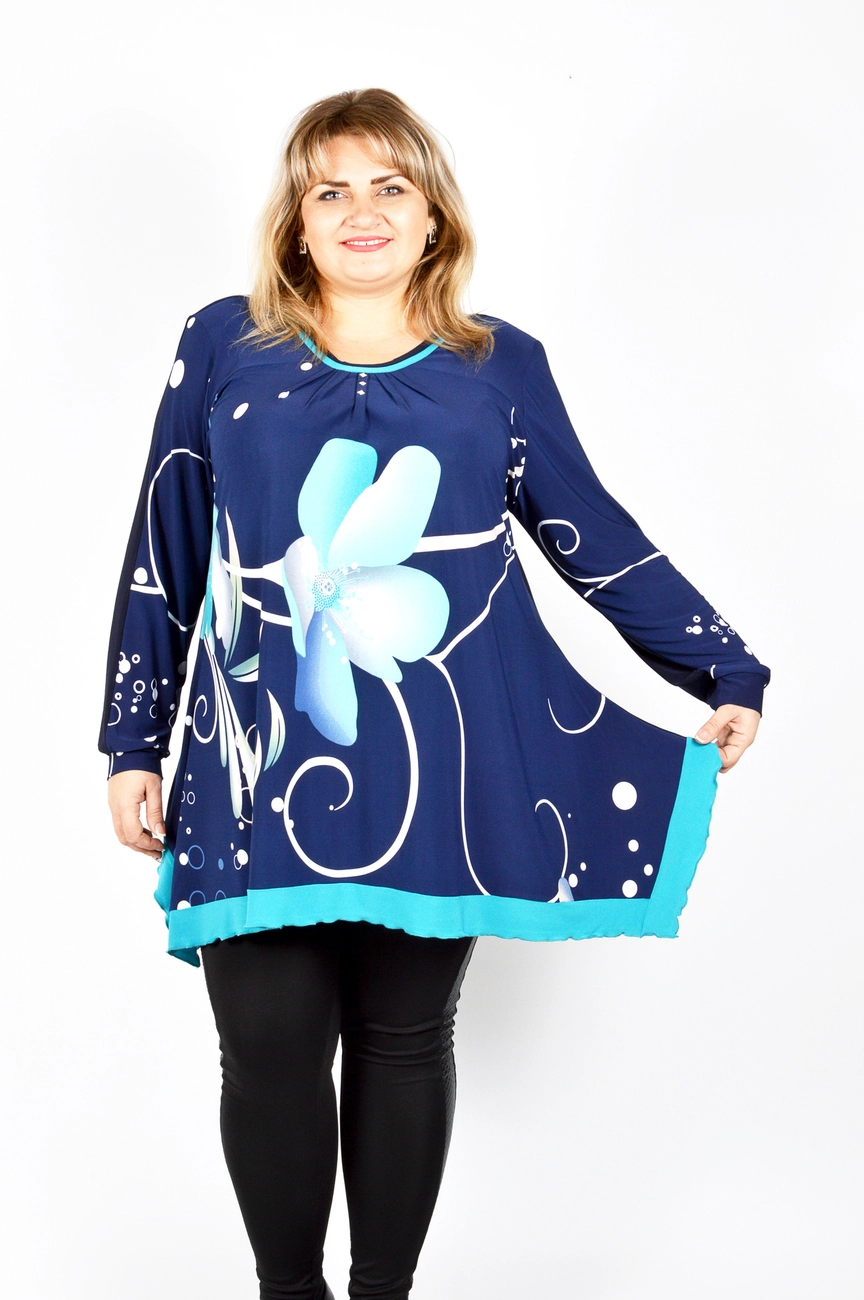 Ткань : масло -70% полиэстер; 20% вискоза; 10% эластан. Туника полуприлегающего силуэта из ткани масло. Низ изделия широкий , прямой. Рукав длинный , горловина круглая. Туника присобрана у горловины. Спинка изделия однотонная - синяя.Ткань не требует особого ухода. Размеры : 54-56 ог-116 от-112 об-150 ди-81; 58-60 ог-124 от-120 об-158 ди-81; 62-64 ог-132 от-128 об-166 ди-81