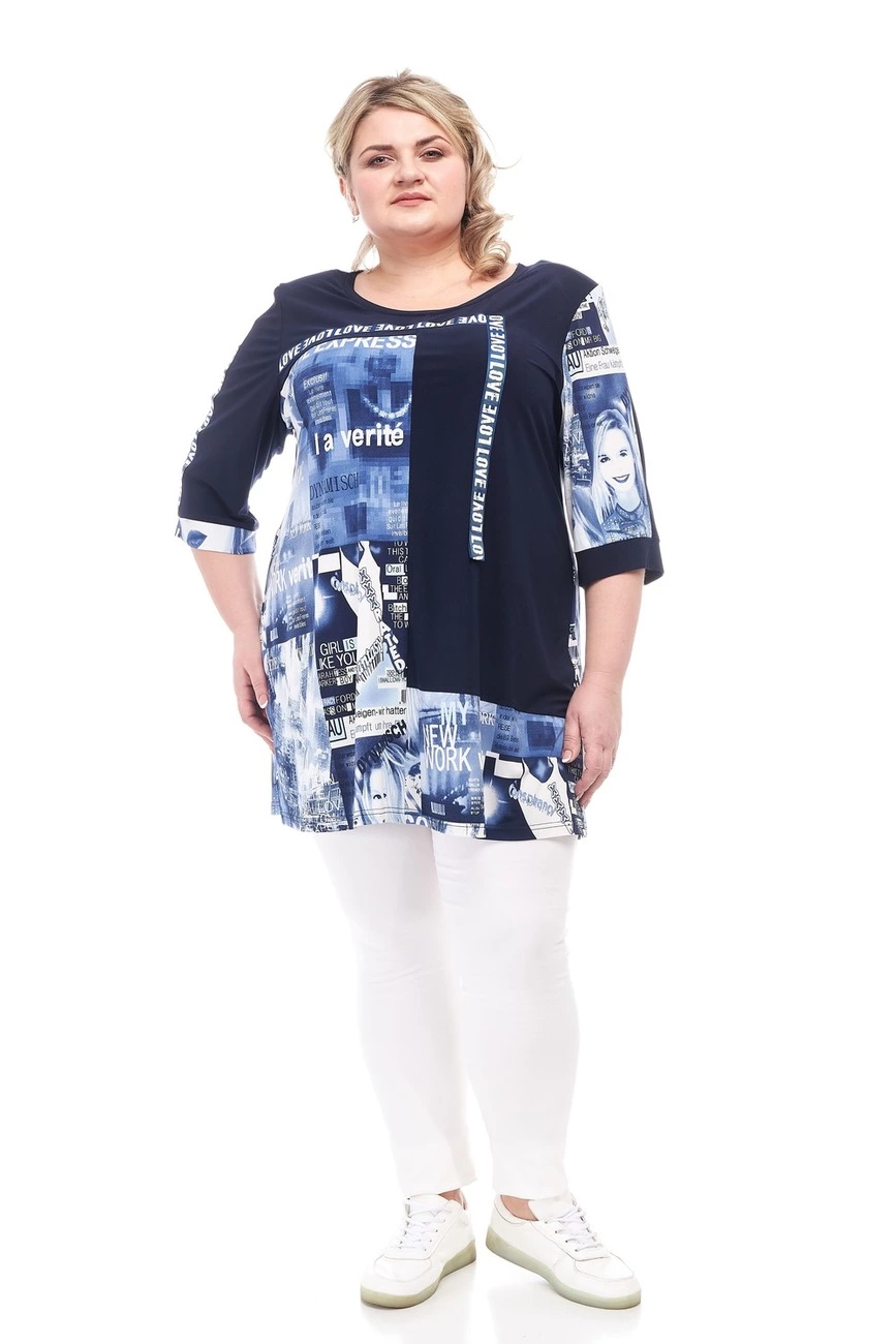 Тканина: масло-70% поліестер; 20% віскоза; 10% еластан. Стильна, яскрава туніка вільного силуету, з тканини олія. Рукав 3/4, горловина кругла. Виріб візуально складається з асиметричних шматочків. Тканина вищої якості не вимагає особливого догляду.