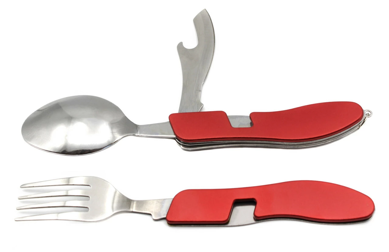 Универсальный походной мультитул. В ассортименте мультитула ложка, вилка, нож, открывалка. В сложенном виде 10х3.5 см. Упакован в коробку.
