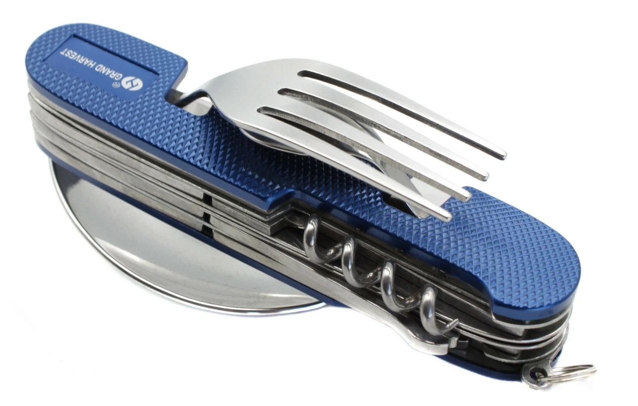 Мультитул имеет ложку, вилку, ложку, чайную ложку и другие полезные штучки. Достаточно прочный мультитул. Отпускается оптом.