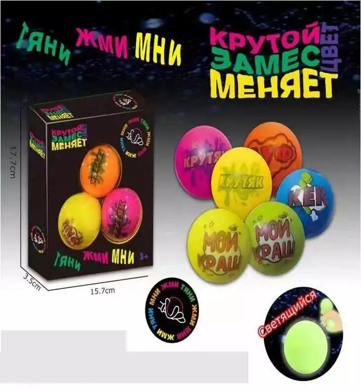 Тягучка C 51252 (128) 3 м`ячика з написами, міняє колір, російська мова, у коробці