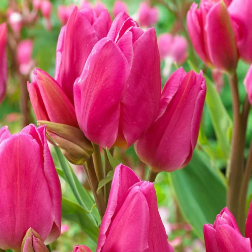 Темно-розовый тюльпан Мультифлора Happy Family действительно похож на счастливую семью. Из одной луковицы вырастает 5-6 цветов одновременно, один из которых самый большой, второй чуть поменьше, и остальные детки небольшого размера.
