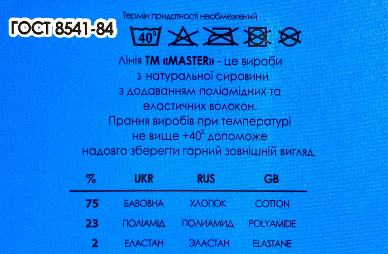 Склад: Бавовна — 75%; поліефір — 23%; еластан — 2%.