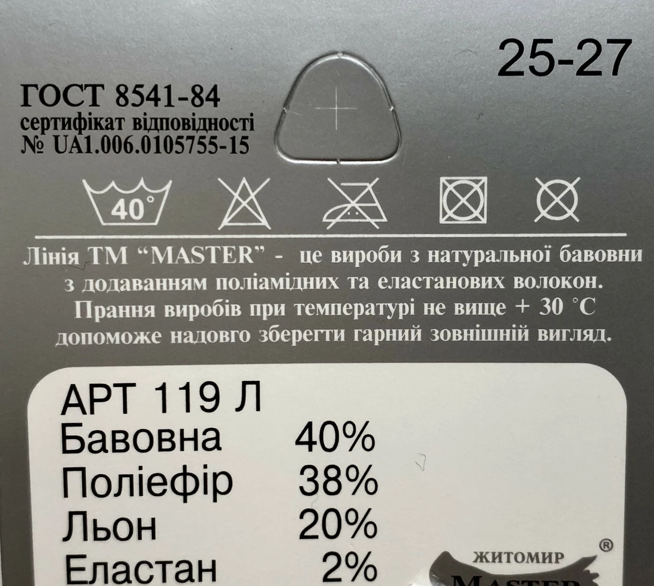 Склад: Бавовна — 40%; поліефір — 38%; льон — 20%; еластан — 2%.