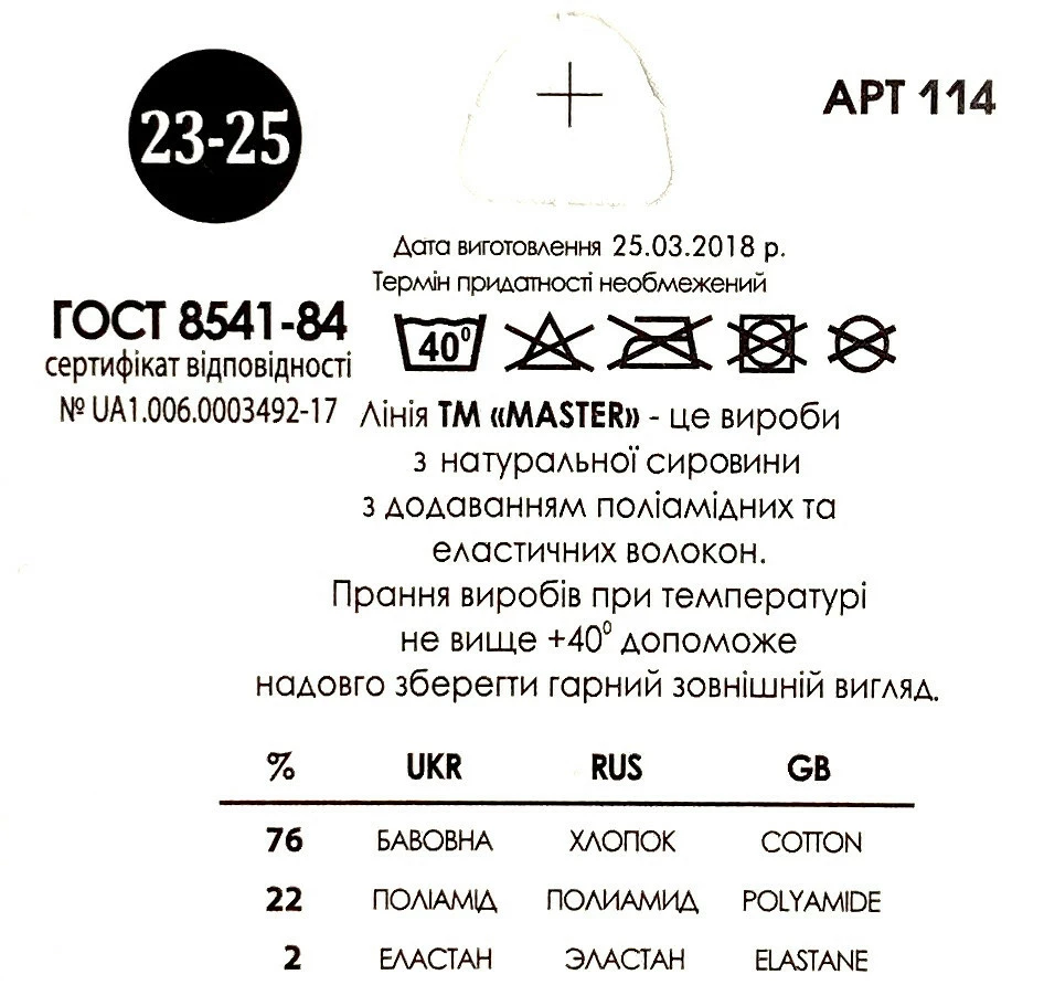 Склад: Бавовна – 76%, поліамід – 22%, еластан – 2%.