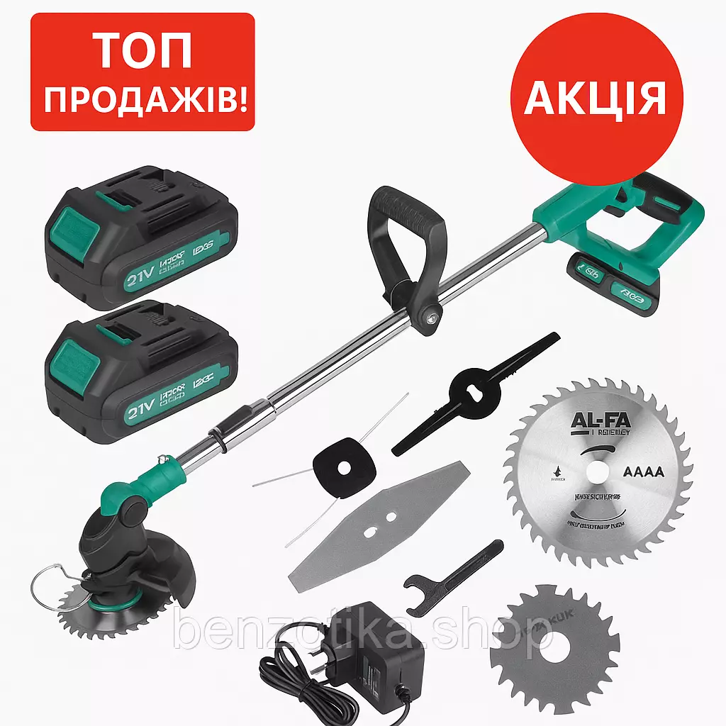 Аккумуляторный триммер ALFA ALCGT2B-21V с насадками и 2 батареями –