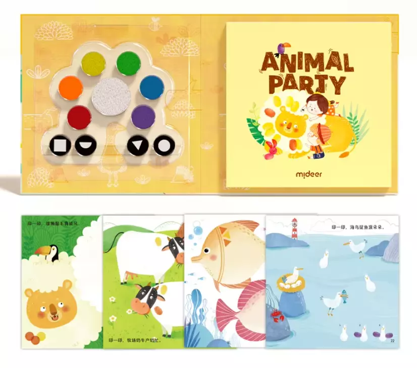 пальчиков, мягкую губку для очистки и 4 печатки для создания