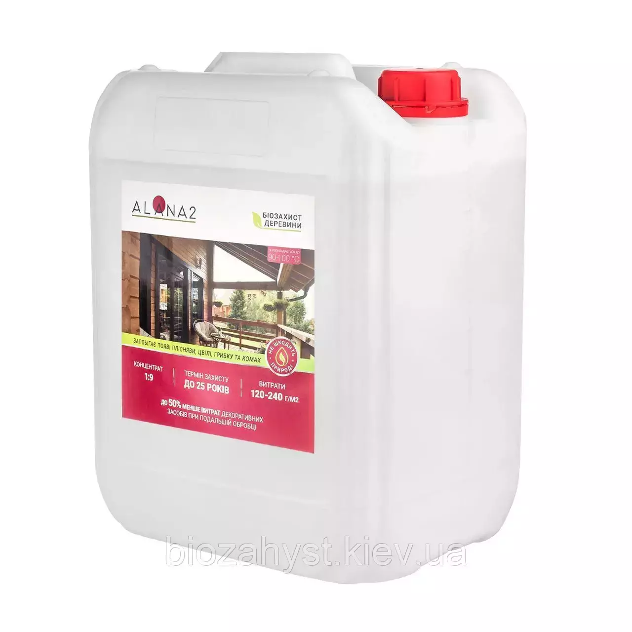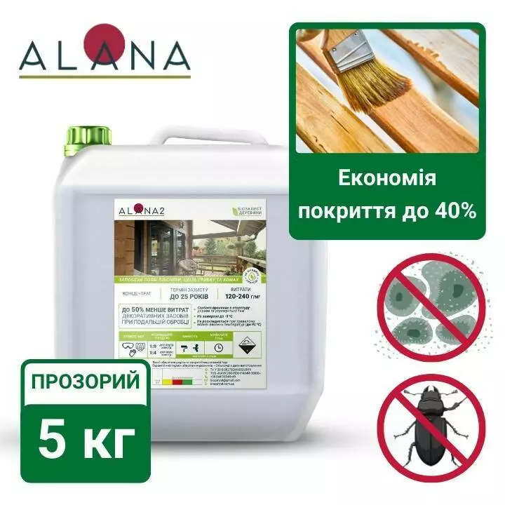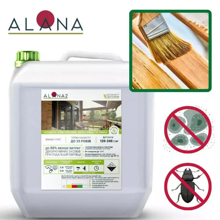 АЛАНА2 є вогнебіозахисні складом для обробки деревних конструкцій використовуються всередині і зовні приміщень. Особливістю АЛАНА2 є те, що вона є концентратом. Це означає, що Ви можете дуже вигідно обробити свою будівлю і при цьому бути впевненим в якості захисту. Так для зовнішніх конструкцій концентрація становить 1:4 а для внутрішніх 1:9. Таким чином з 1 кг концентрату, ви можете отримати 5кг для обробки зовнішніх конструкцій та 10кг для обробки внутрішніх конструкцій.