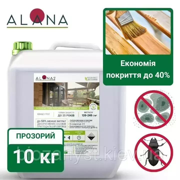 Антисептик Алана-2 1:9 для обробки дерев'яних конструкцій, 10 кг, функція ґрунтування, не замерзає до -7