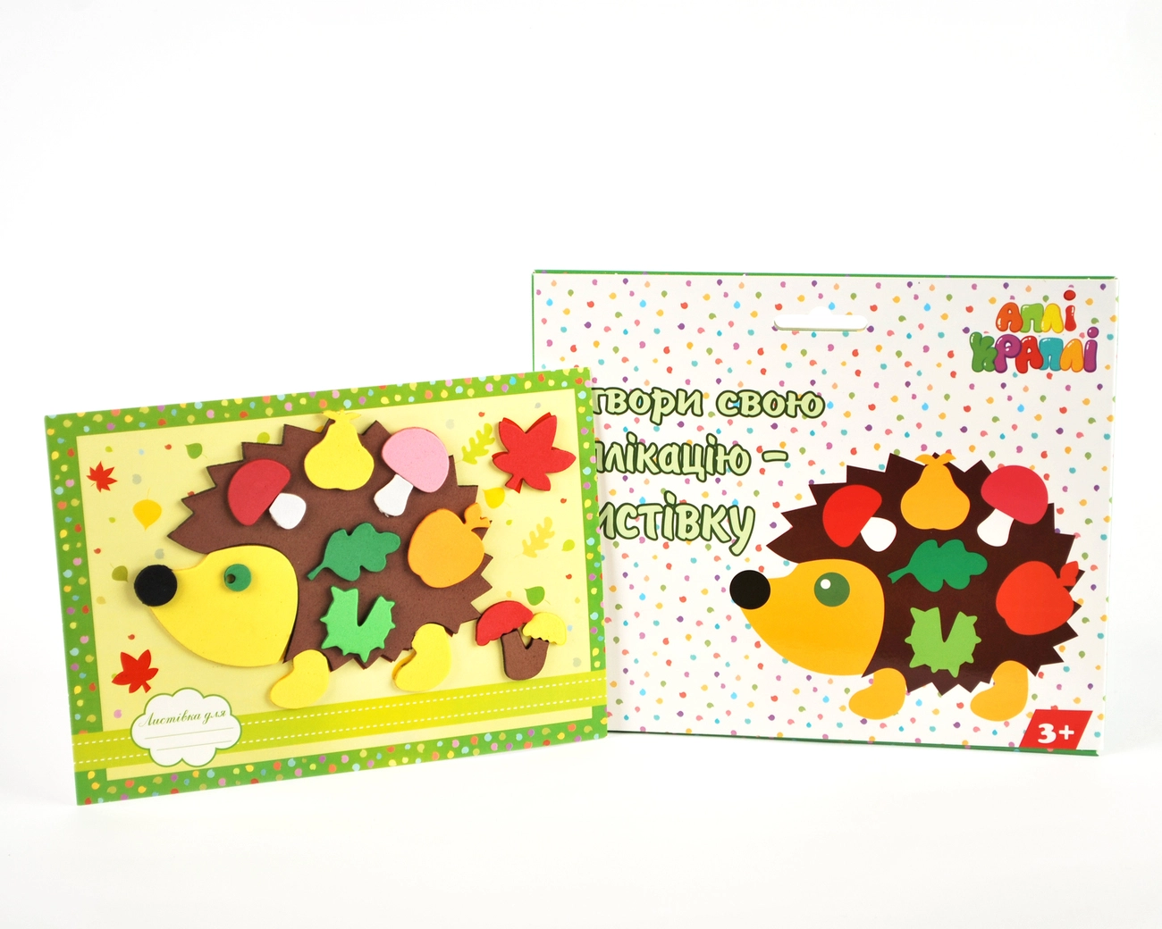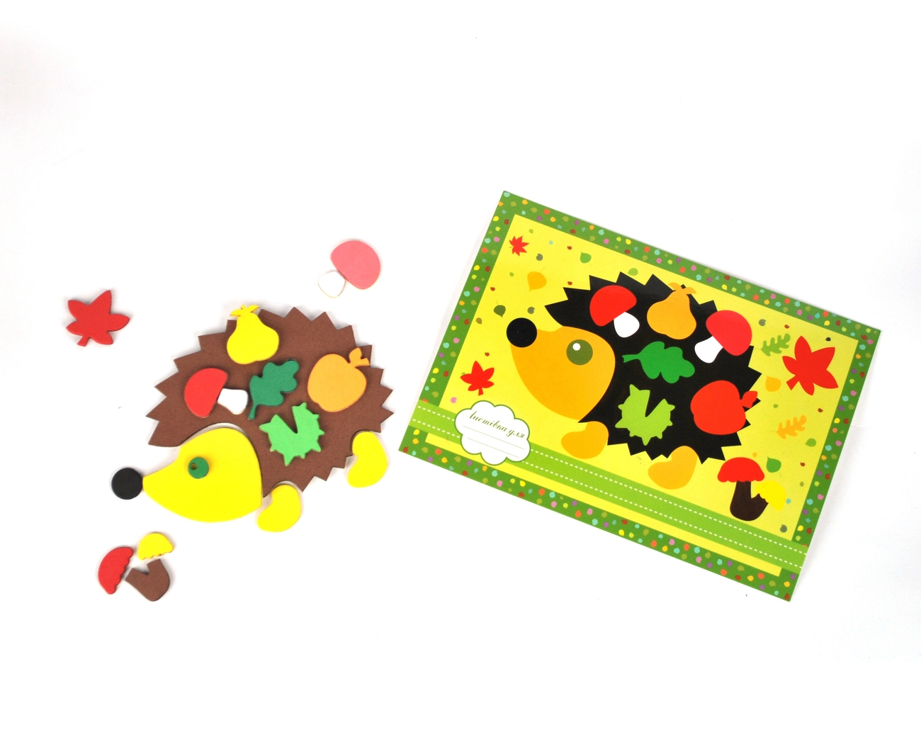 Аплікація-листівка "Їжачок" - це дитячий набір в який входить картонна листівка з нанесеним на неї контуром для підклеювання деталей. Також після поклейки композиції з дитиною можна її підписати в спеціальному полі.