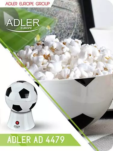 Попкорн на матч? Отличное сочетание! Особенно шарообразный попкорн Adler AD 4479! Машину отличает уникальный дизайн, который непременно порадует любителей футбольных игр. В то же время, приготовление попкорна происходит быстро и, самое главное, без жира. Таким образом, вы можете наслаждаться попкорном здоровым способом. Крышка AD 4479 также служит миской, в которой вы подаете попкорн для вашей семьи или приглашенных гостей.