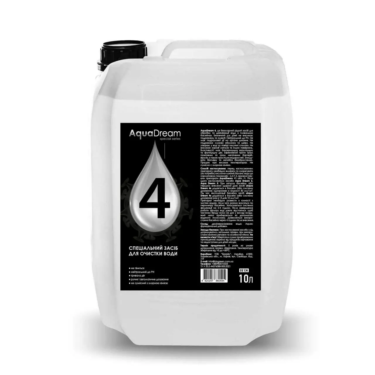 AquaDream 4 це безхлорний рідкий засіб для обробки та дезінфекції води в плавальних басейнах. Безпечний для дітей не викликає подразнень та алергії. Нейтральний до рН. Не має подразливої дії на органи дихання. Не подразнює слизову оболонку та шкіру. Не утворює у воді та повітрі токсичні сполуки. Не викликає корозії металів та інших поверхонь. Властивості: має бактерицидну воруліцидну та фунгіцидну дію. Ефективний проти грампозитивних та грамнегативних бактерій, вірусів, а також простіших водоростей. Знищує біоплівку та запобіга біообростанню. Працює при високих температурах. Несумісний с хлорною хімією.