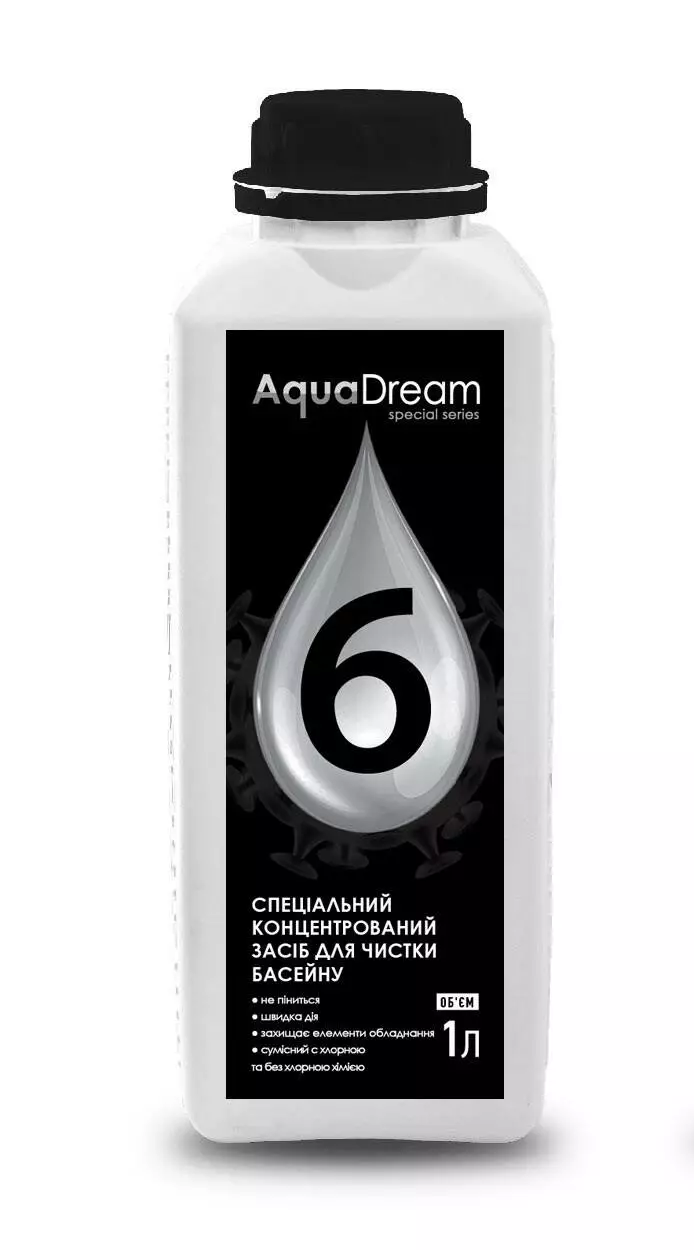 AquaDream 6 спеціальний концентрований рідкий засіб, призначений для чистки басейнів з кераміки, клінкеру, ПВХ, акрилу, та композитів тощо. Засіб використовується для видалення біообростання та мінеральних відкладень, видаляє слиз, бактерії, водорості, гриби. Легко розчиняє забруднення, що важко виводяться, видаляє відклади вапна, іржі, а також інші мінеральні відкладення.
